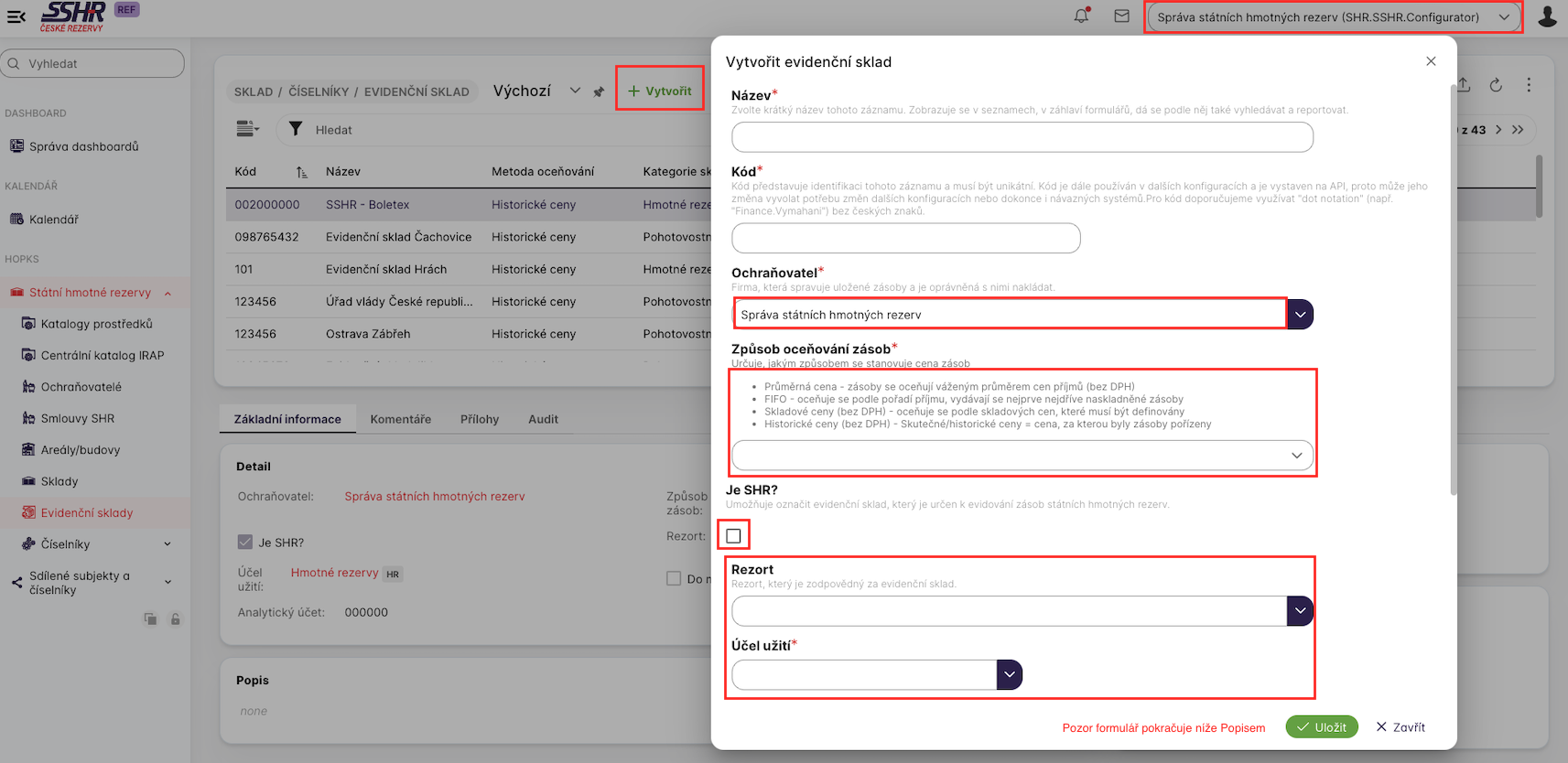 Uživatel s rolí SHR.Defender.Configurator může vytvořit nový evidenční sklad neSHR.