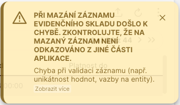 Pokud je vybraný evidenční sklad použit, tj. existují v systému vazby (vytvořený skladový doklad s tímto evidenčním skladem nebo realizován skladový pohyb, tak systém smazání nedovolí, neboť by došlo k podstatnému narušení dat. Systém zobrazí následující hlášku: