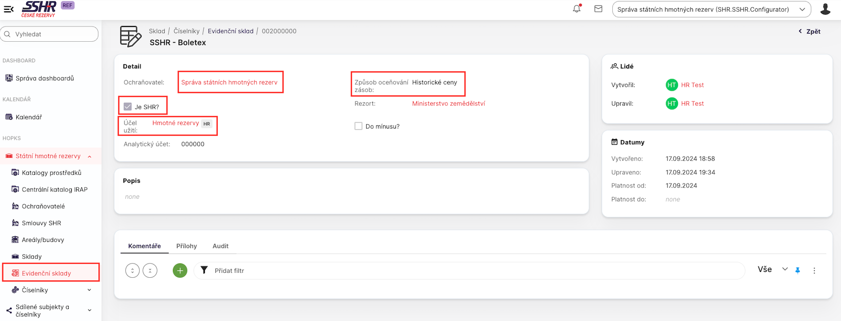 Pouze uživatel SHR.SSHR.Configurator může zaškrtnout pole je SHR? Pokud tak učiní, tak tento evidenční sklad po vytvoření nemůže být editován ochraňovatelem.