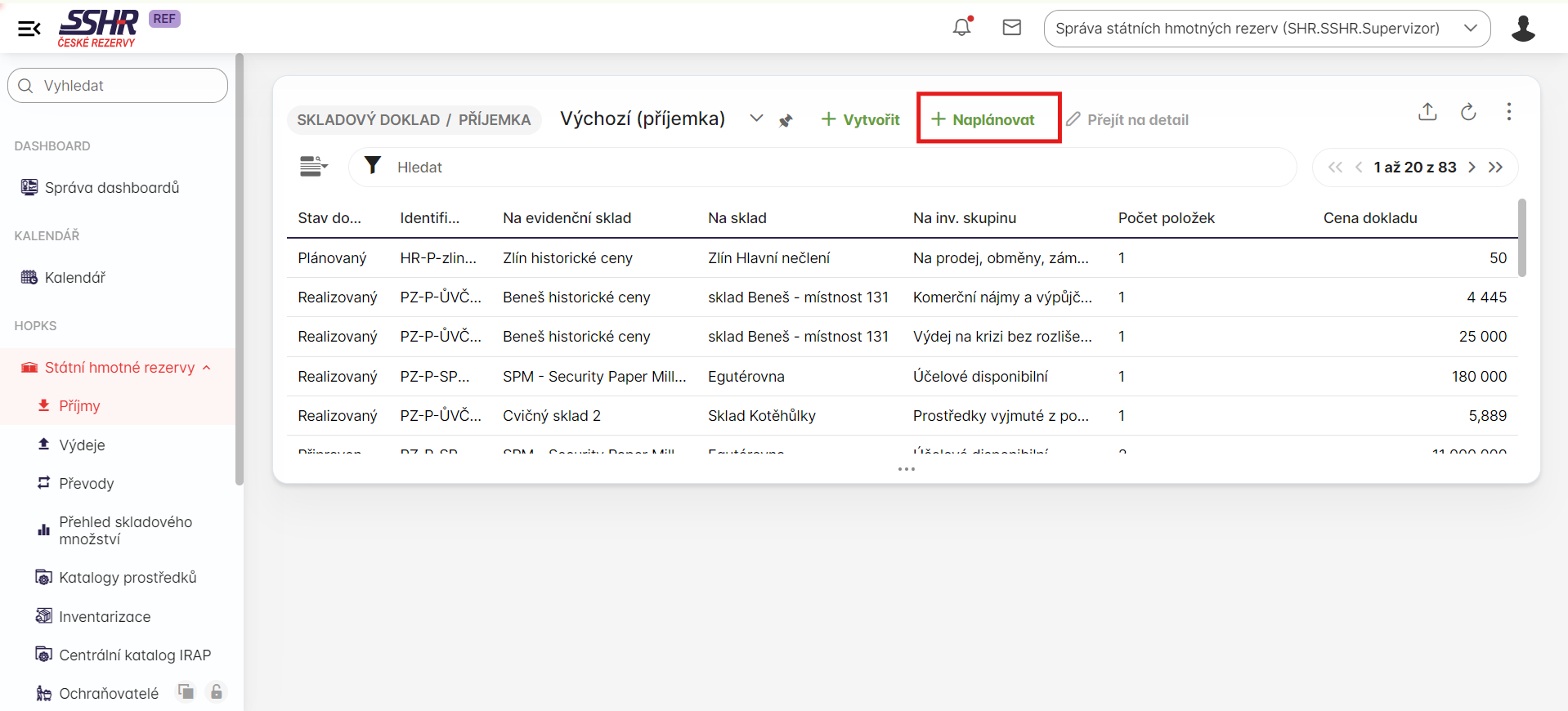 Pro každý typ dokladu (Příjem, Výdej, Převod) je možné vytvořit plán dokladu. Plán dokladu je možné vytvořit na přehledu jednotlivých typů dokladu za roli SHE.SSHR.Supervizor.