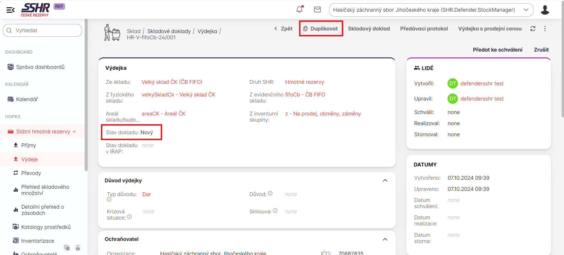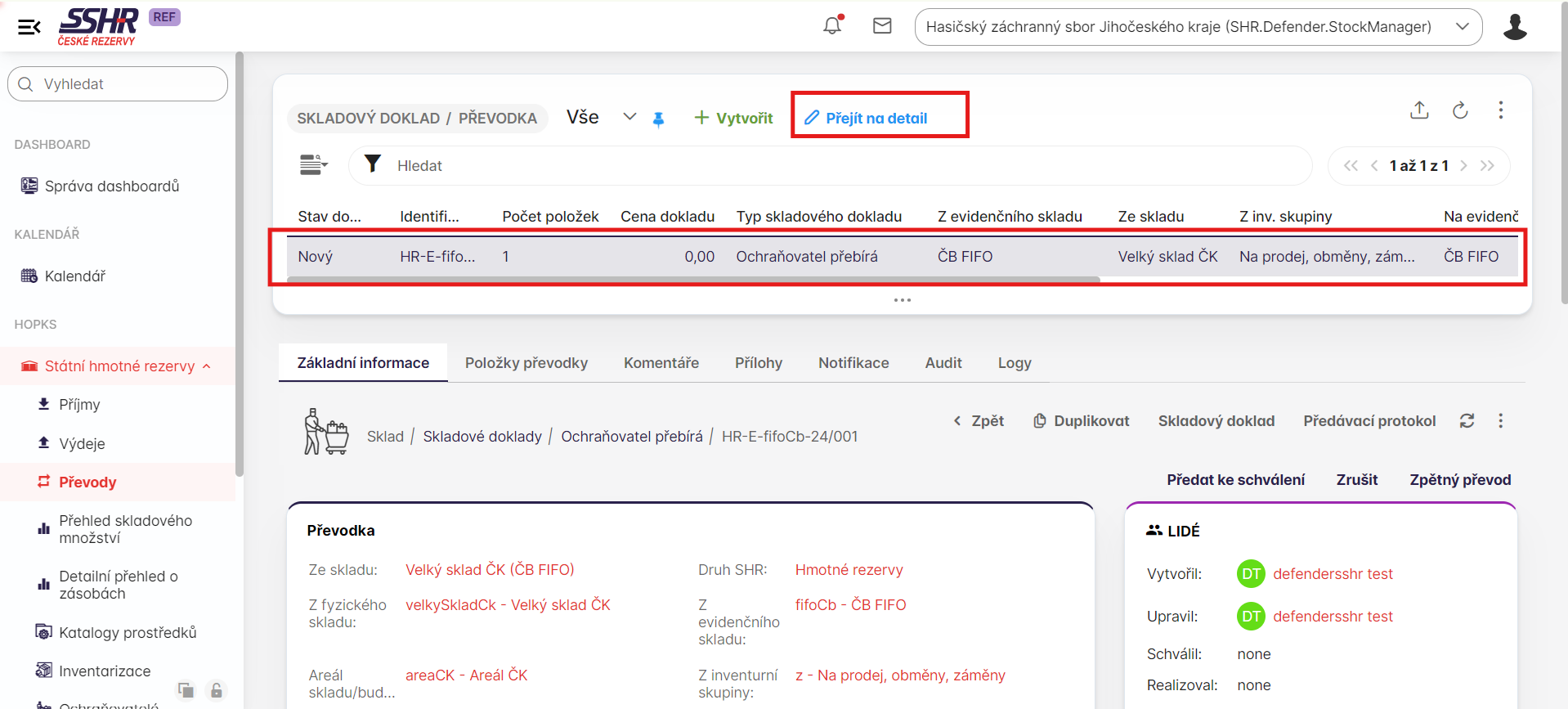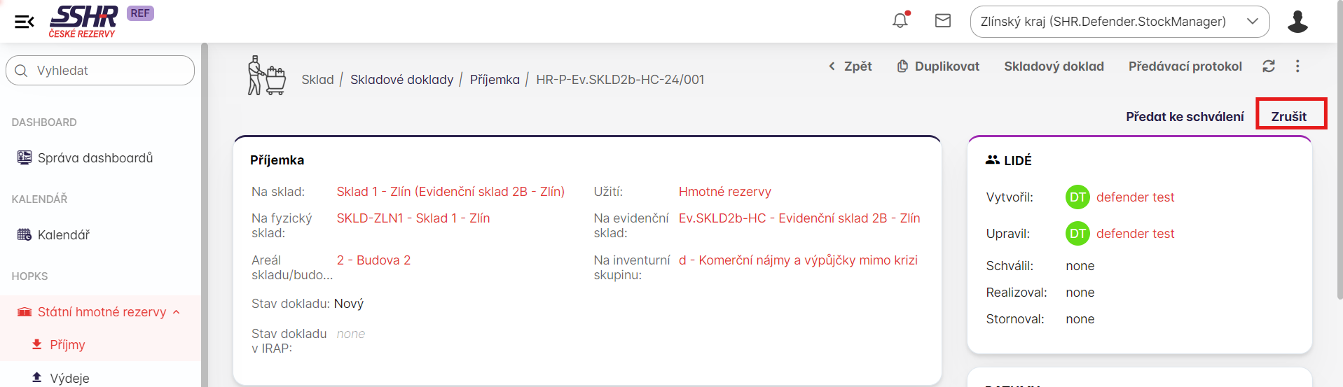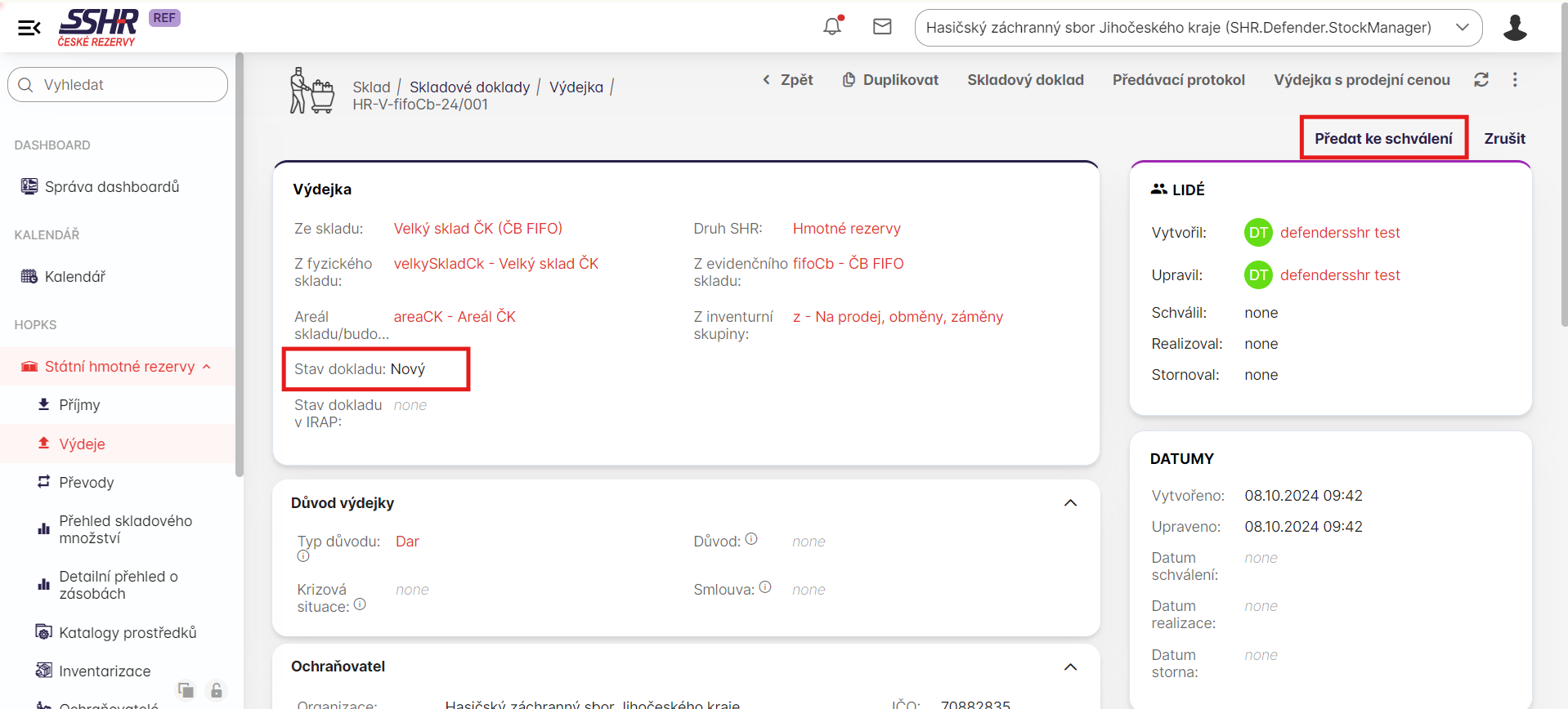 Právě vytvořený doklad přes tlačítko "Vytvořit" bude vždy začínat ve stavu "Nový". Ve stavu "Nový" se uživateli zobrazují tlačítka "Předat ke schválení" a "Zrušit". Tlač ítko "Předat ke schválení" slouží pro roli SHR.Defender.StockOperator v případě změn na detailu dokladu po vytvoření. Doklad je tímto předán ke schválení roli SHR.Defender.StockManager, který zkontroluje změny a učí jejich korektnost. Role SHR.Defender.StockManager má možnost použít tlačítko "Předat ke schválení" pro situaci, ve které by nebyl SHR.Defender.StockOperator zapotřebí.