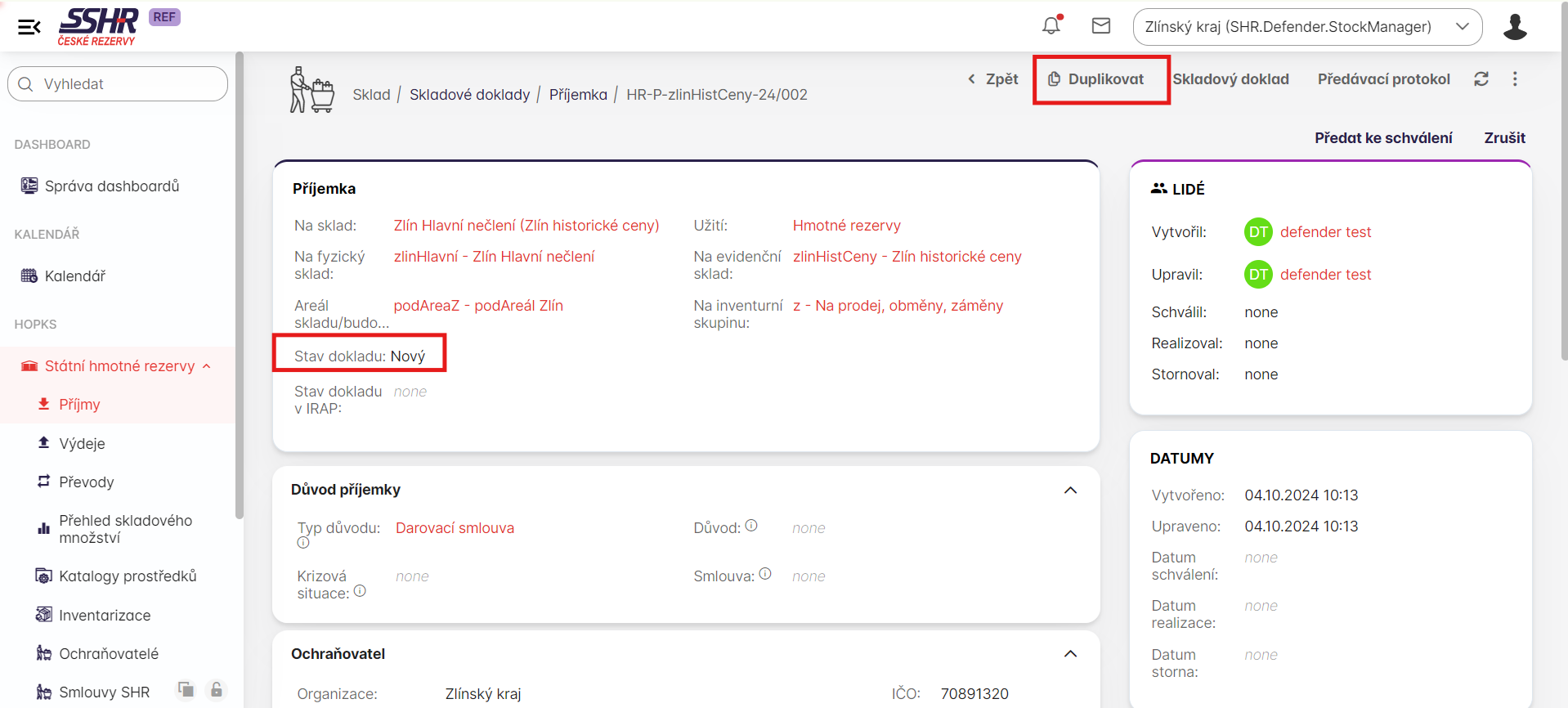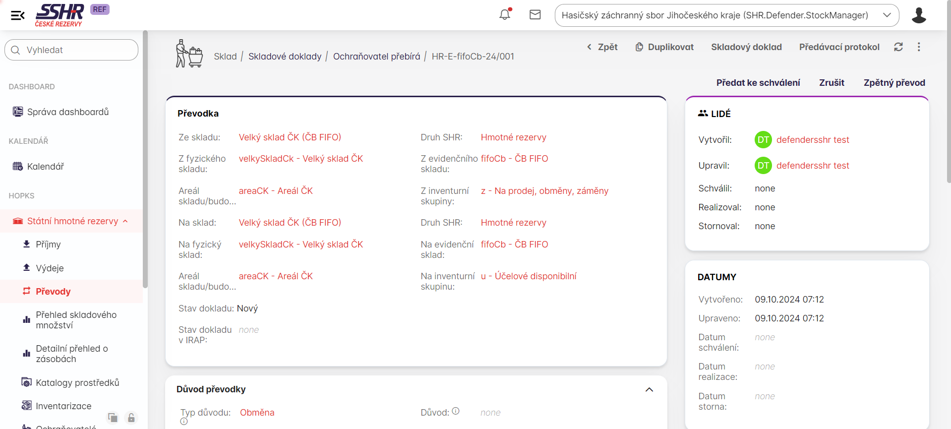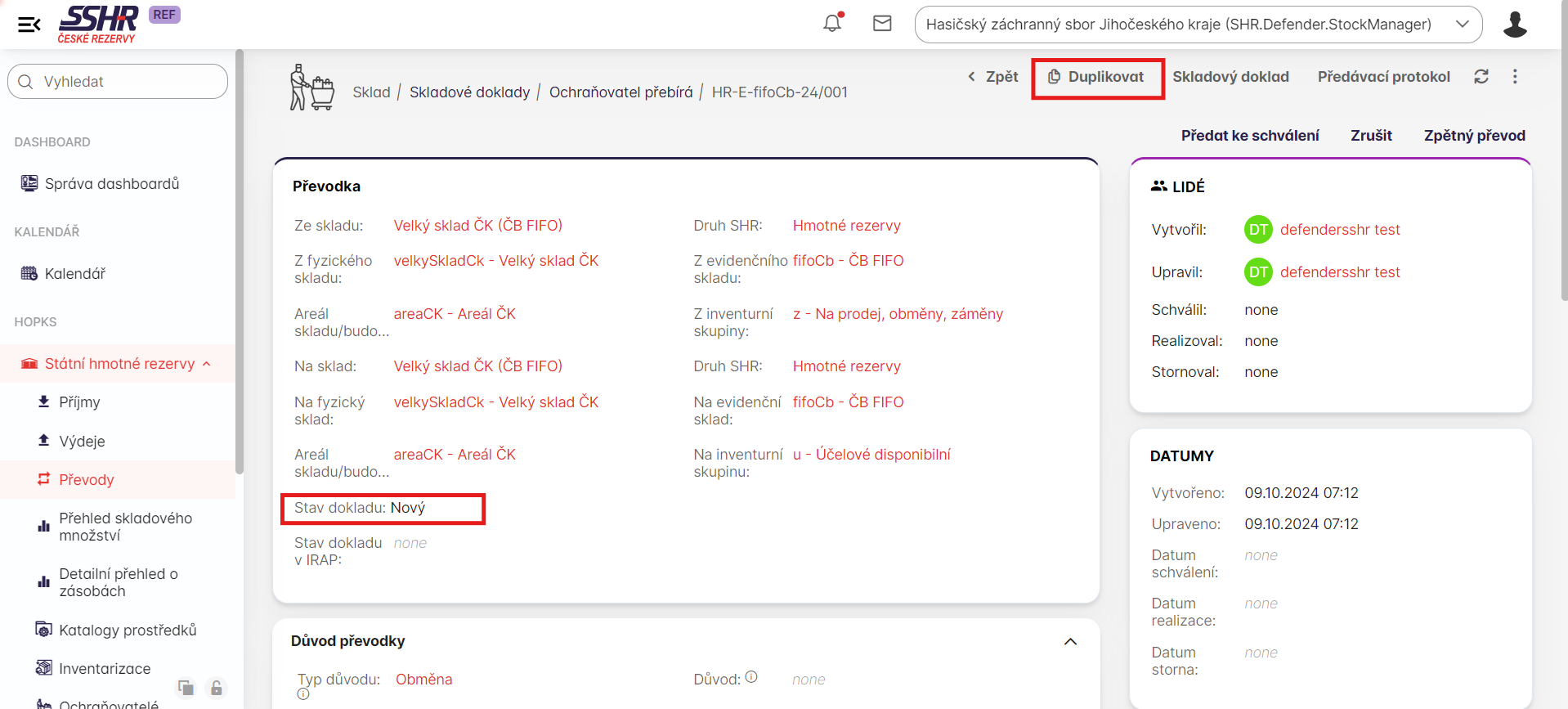 Právě vytvořený doklad přes tlačítko "Vytvořit" bude vždy začínat ve stavu "Nový". Ve stavu "Nový" se uživateli zobrazují tlačítka "Předat ke schválení" a "Zrušit". Tlač ítko "Předat ke schválení" slouží pro roli SHR.Defender.StockOperator v případě změn na detailu dokladu po vytvoření. Doklad je tímto předán ke schválení roli SHR.Defender.StockManager, který zkontroluje změny a učí jejich korektnost. Role SHR.Defender.StockManager má možnost použít tlačítko "Předat ke schválení" pro situaci, ve které by nebyl SHR.Defender.StockOperator zapotřebí.