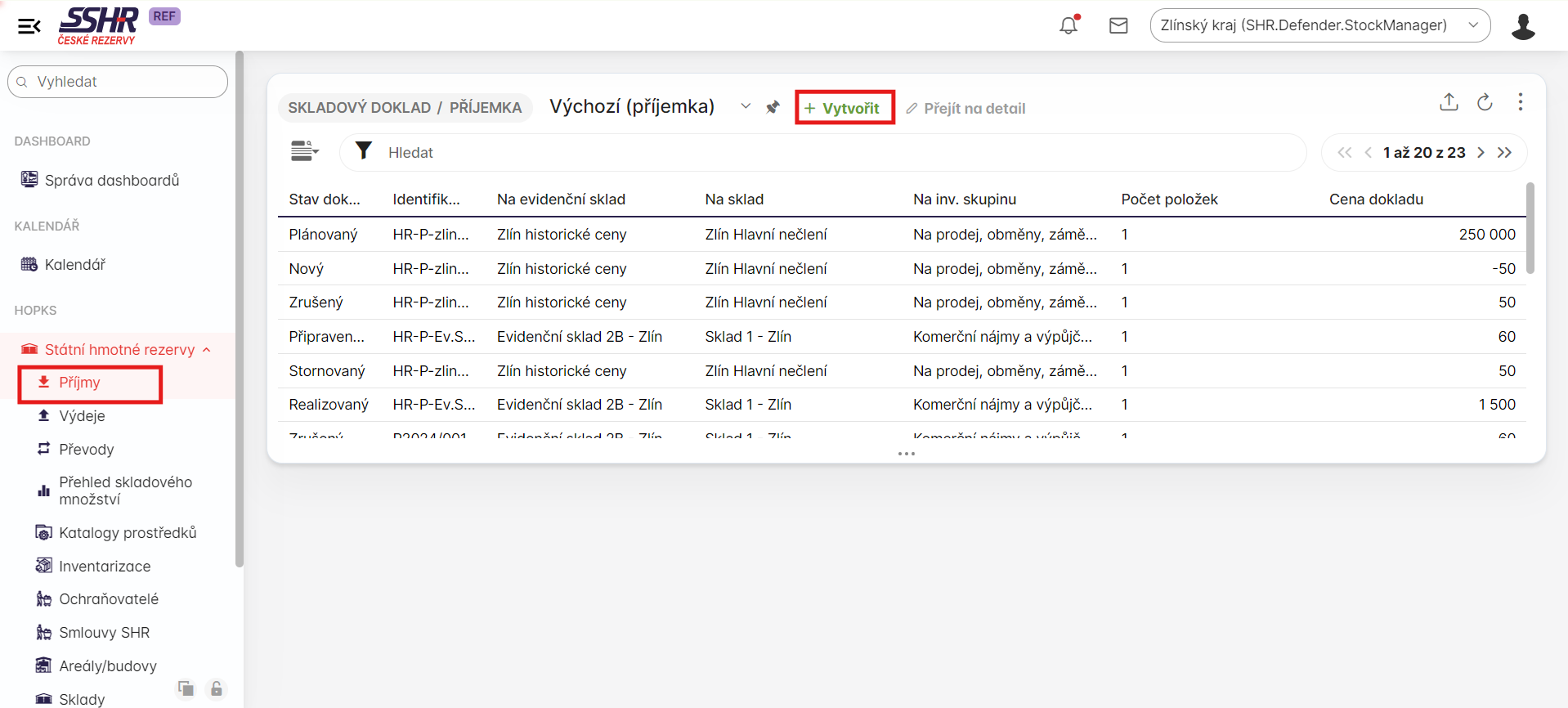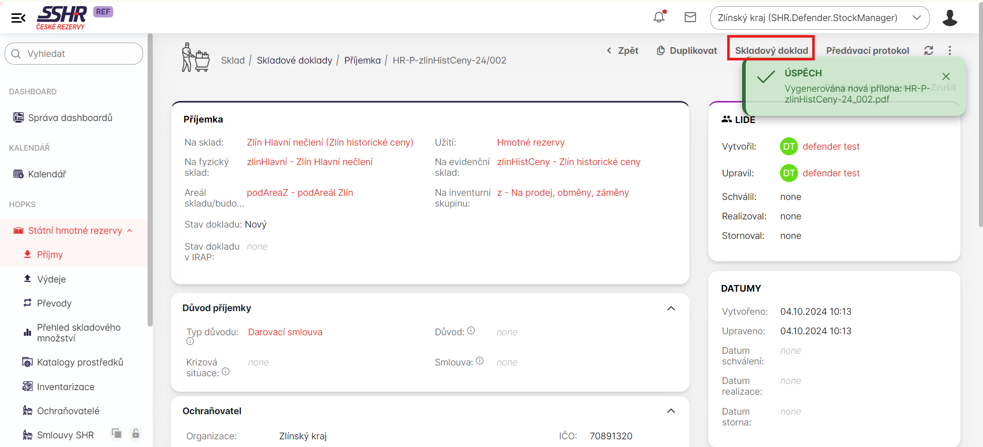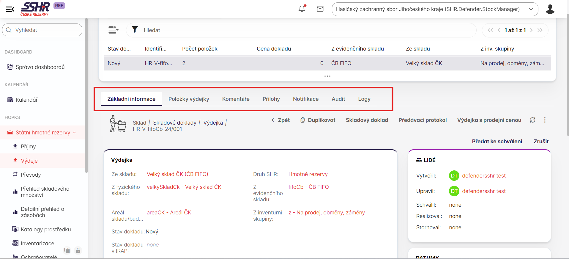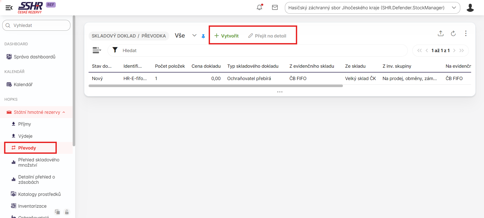 Právě vytvořený doklad přes tlačítko "Vytvořit" bude vždy začínat ve stavu "Nový". Ve stavu "Nový" se uživateli zobrazují tlačítka "Předat ke schválení" a "Zrušit". Tlač ítko "Předat ke schválení" slouží pro roli SHR.Defender.StockOperator v případě změn na detailu dokladu po vytvoření. Doklad je tímto předán ke schválení roli SHR.Defender.StockManager, který zkontroluje změny a učí jejich korektnost. Role SHR.Defender.StockManager má možnost použít tlačítko "Předat ke schválení" pro situaci, ve které by nebyl SHR.Defender.StockOperator zapotřebí.