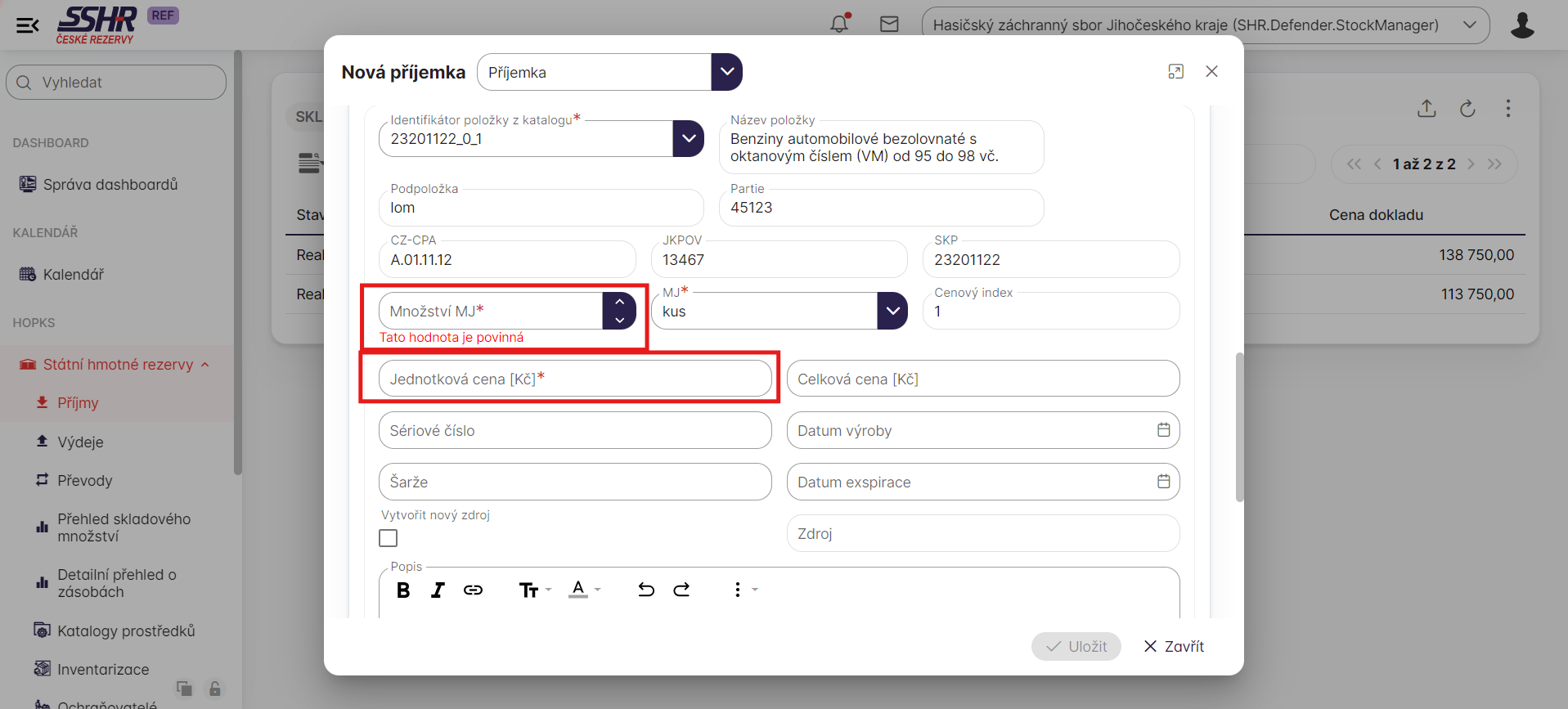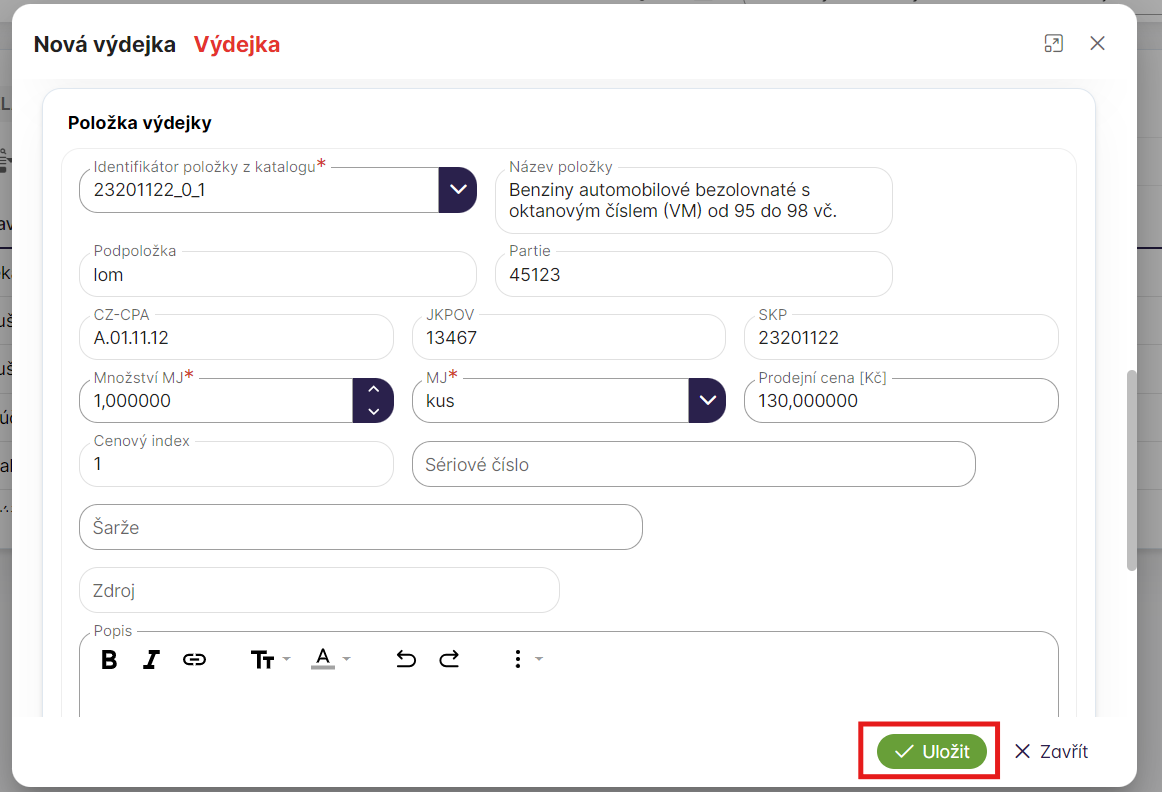 Po vybrání položky se automaticky doplní většina polí položky na základě dat z katalogu pro danou položku. Je potřeba dovyplnit pole "Množství" jako cena položky se vezme Jednotková cena, za kterou byla položka "Přijatá" na sklad.