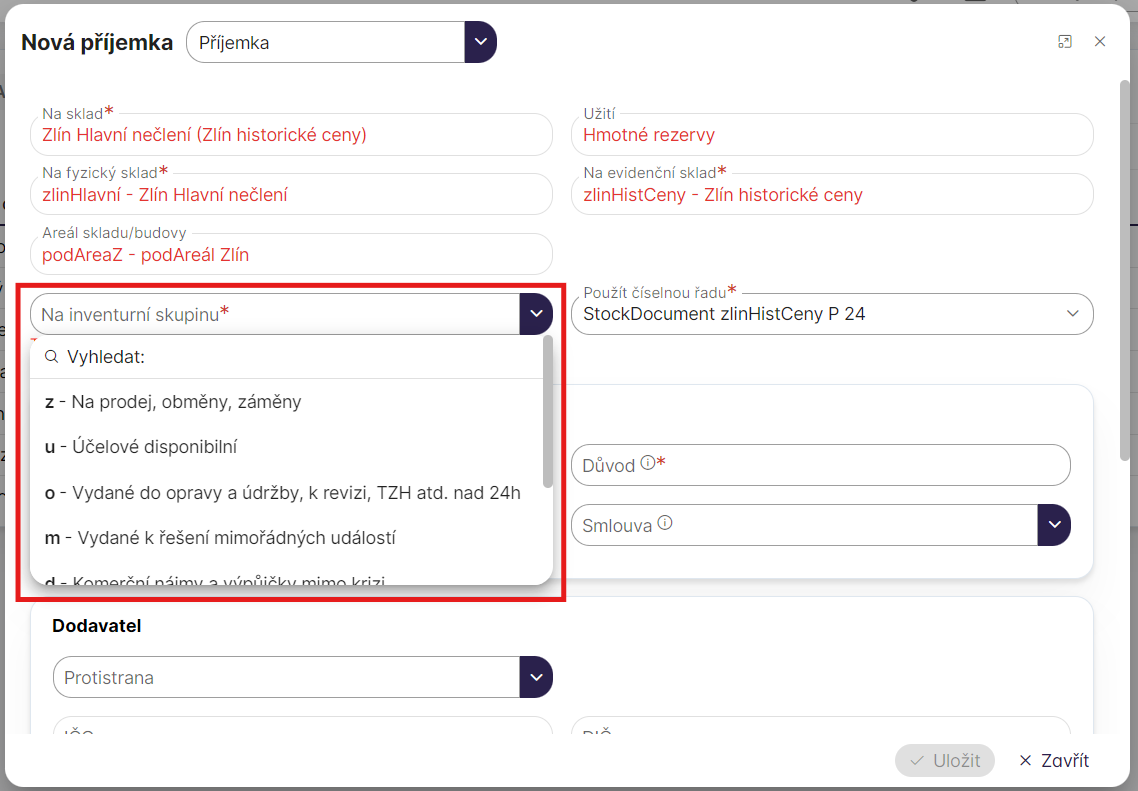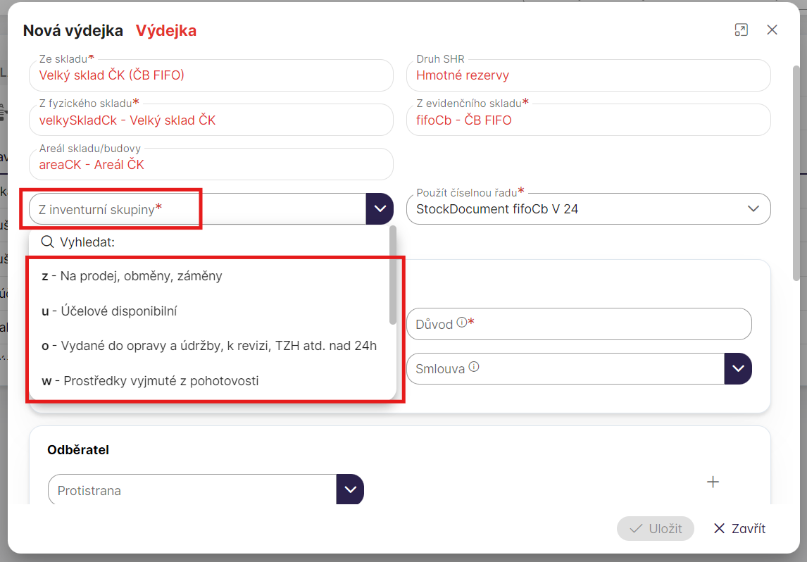 - Pole "Z Inventurní skupinu" - Do pole "Inventurní skupina" se vybere inventurní skupina položky, pro kterou doklad vytváříme ze seznamu inventurních skupin.