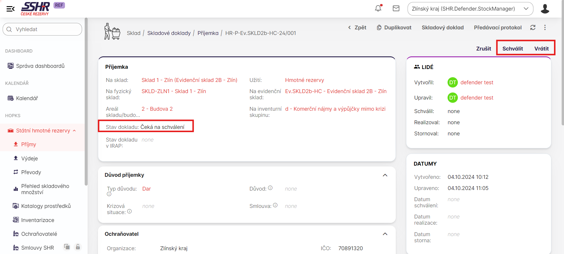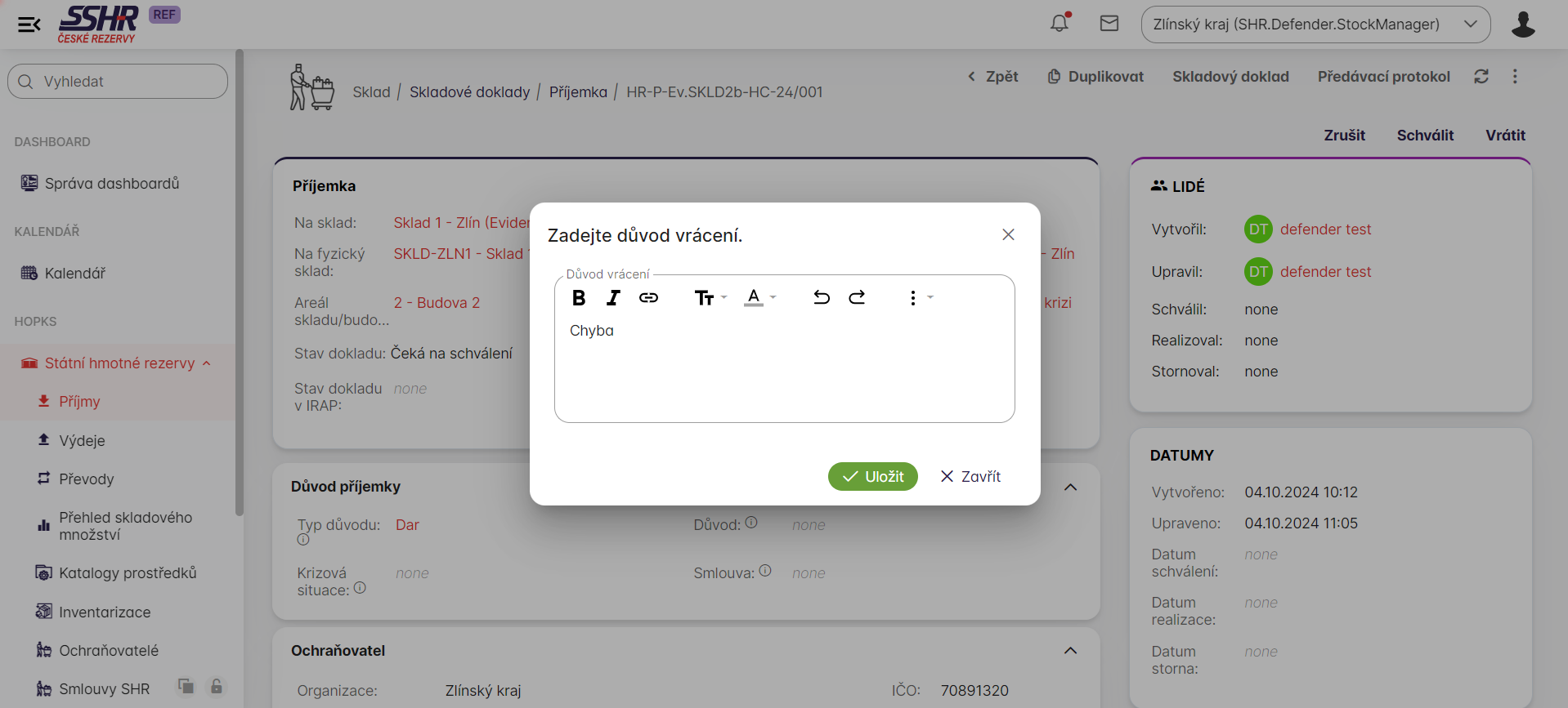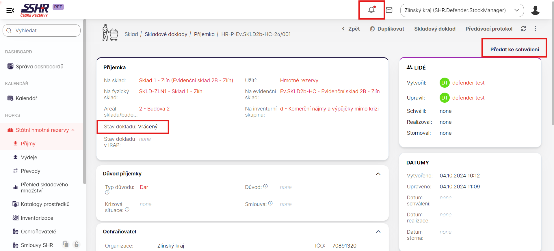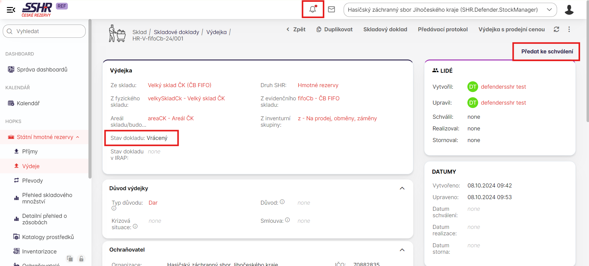 Kliknutím na "Uložit" se změní stav dokladu na "Vrácený", roli SHR.Defender.StockOperator se opět zobrazí tlačítko "Předat ke schválení" a poznámka se mu zobrazí v pravé horní části obrazovky v notifikacích. (Zvoneček)