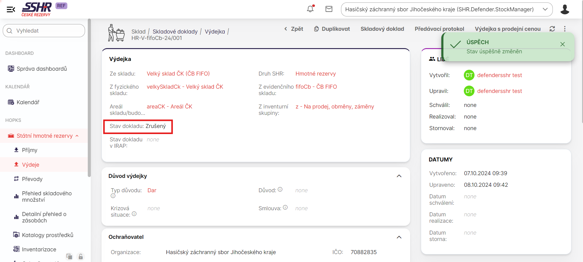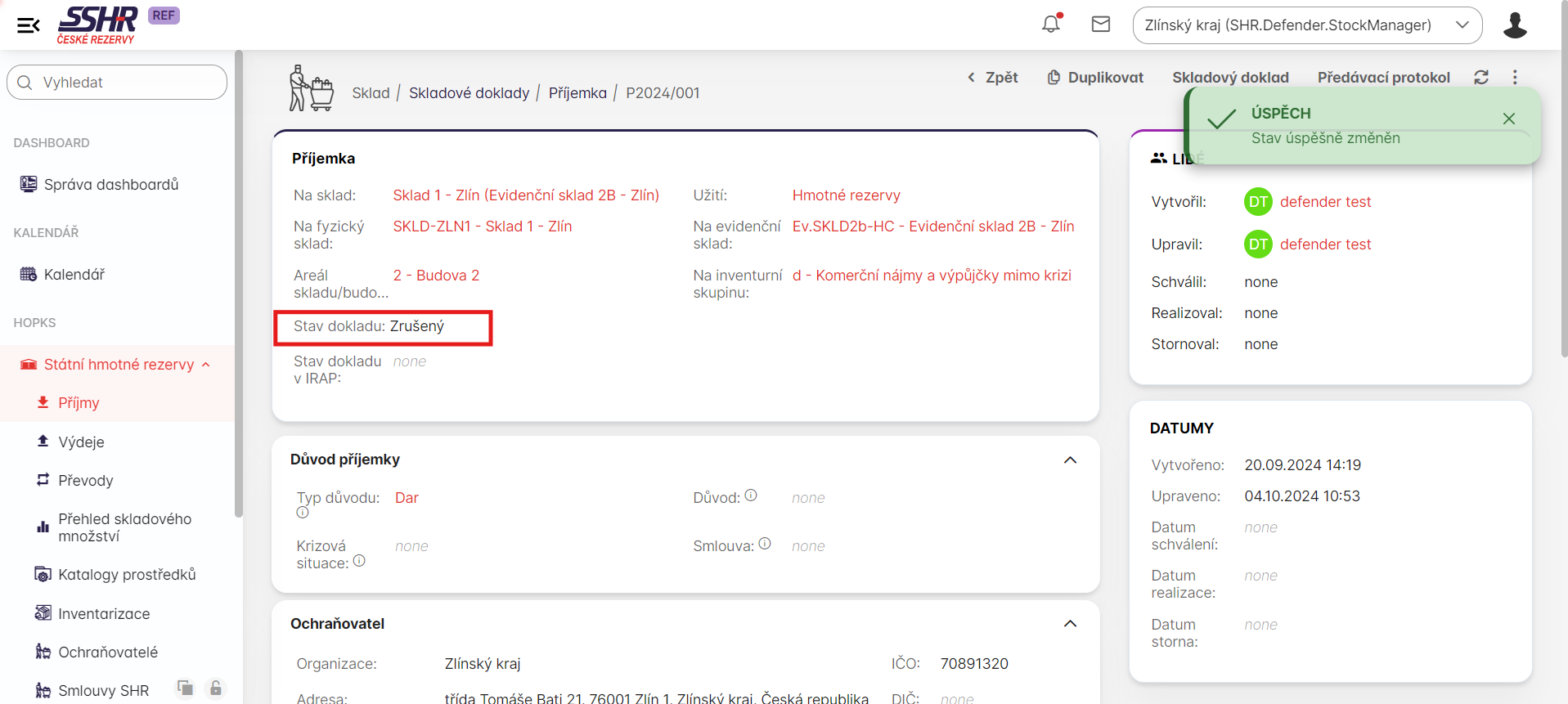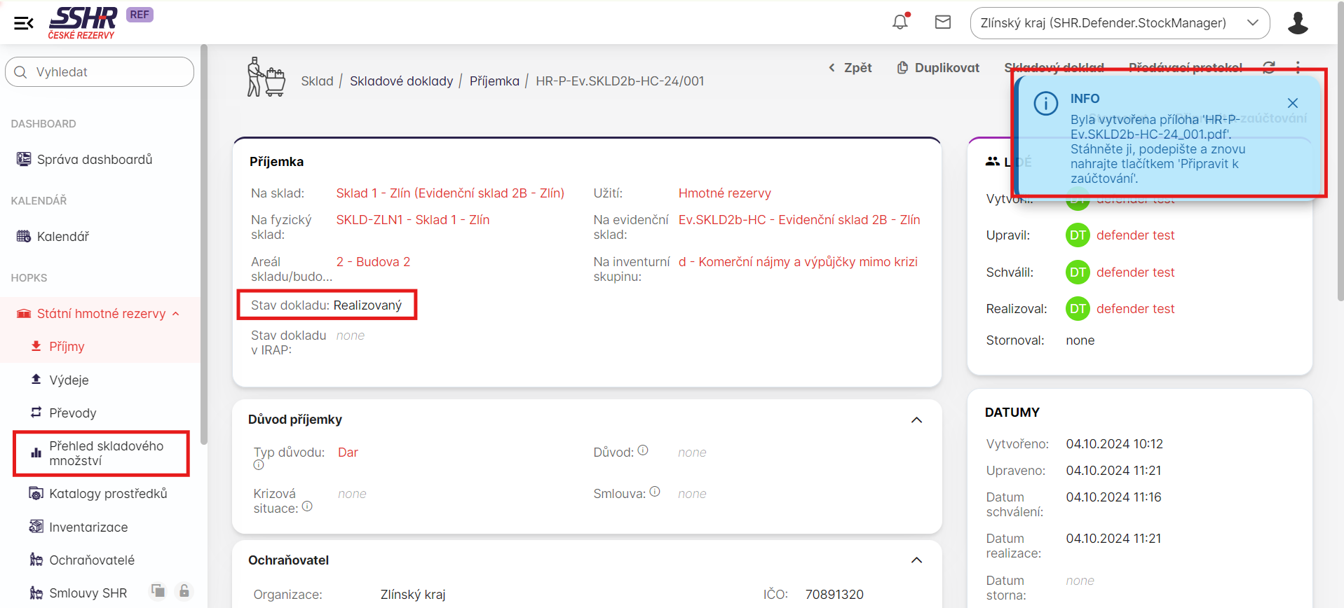 Kliknutím na "Uložit" se změní stav dokladu na "Vrácený", roli SHR.Defender.StockOperator se opět zobrazí tlačítko "Předat ke schválení" a poznámka se mu zobrazí v pravé horní části obrazovky v notifikacích. (Zvoneček)