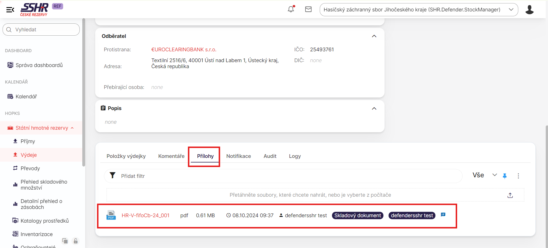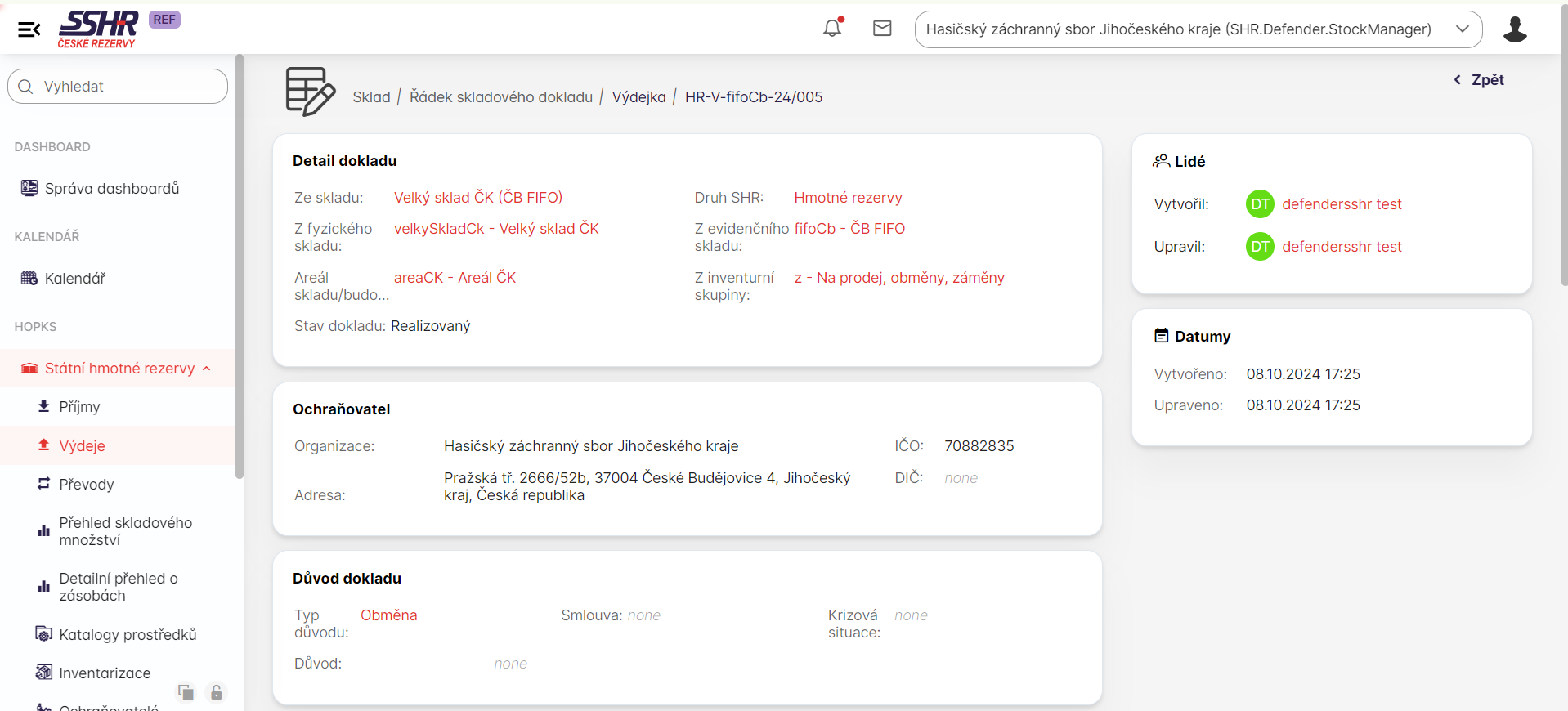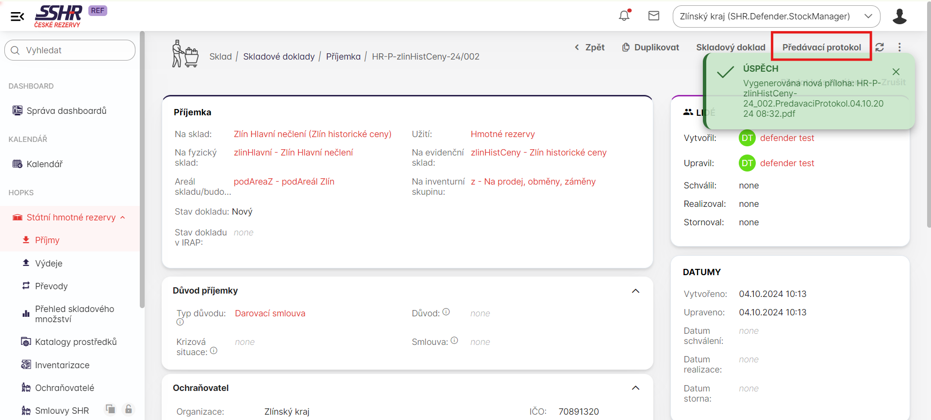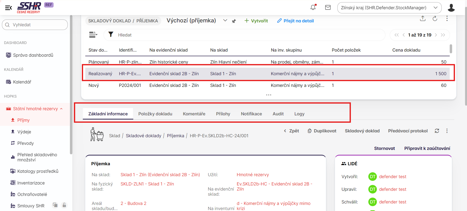 Kliknutím na "Uložit" se změní stav dokladu na "Vrácený", roli SHR.Defender.StockOperator se opět zobrazí tlačítko "Předat ke schválení" a poznámka se mu zobrazí v pravé horní části obrazovky v notifikacích. (Zvoneček)