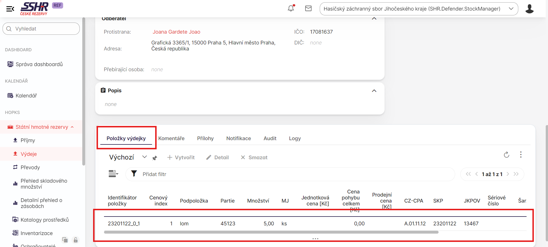 Pokud je "Účel užití" vybraného evidenčního skladu HR (hmotné rezervy) zobrazuje se navíc pole "Prodejní cena" a ta bude použita v dokladu jako cena výdeje. Pro evidenční sklad s "Účelem užití" PZ (pohotovostní rezervy" se pole "Prodejní cena" nezobrazuje.