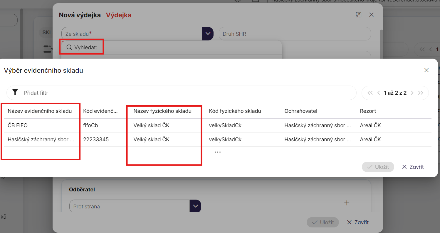 - Pole "Ze skladu" - Do pole "Ze skladu" se vybírá záznam odpovídající vazby mezi fyzickým a evidenčním skladem. Záznam je možné vybrat buď z roletky často používaných záznamů, která se zobrazí při kliknutí do pole, nebo z tabulky záznamů. Pro zobrazení tabulky záznamů je třeba kliknout na lupičku s popisem "Vyhledat" z roletky.