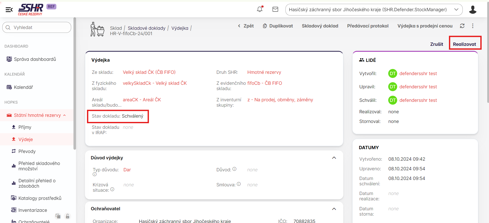 Po opravení chyby je doklad předán znovu ke schválení a pokud už nepřetrvává problém je doklad schválen SHR.Defender.StockManager -em stisknutím tlačítka "Schválit". Tlačítko "Schválit" změní stav dokladu na "Schválený" a místo "Schválit" zobrazí další tlačítko "Realizovat".