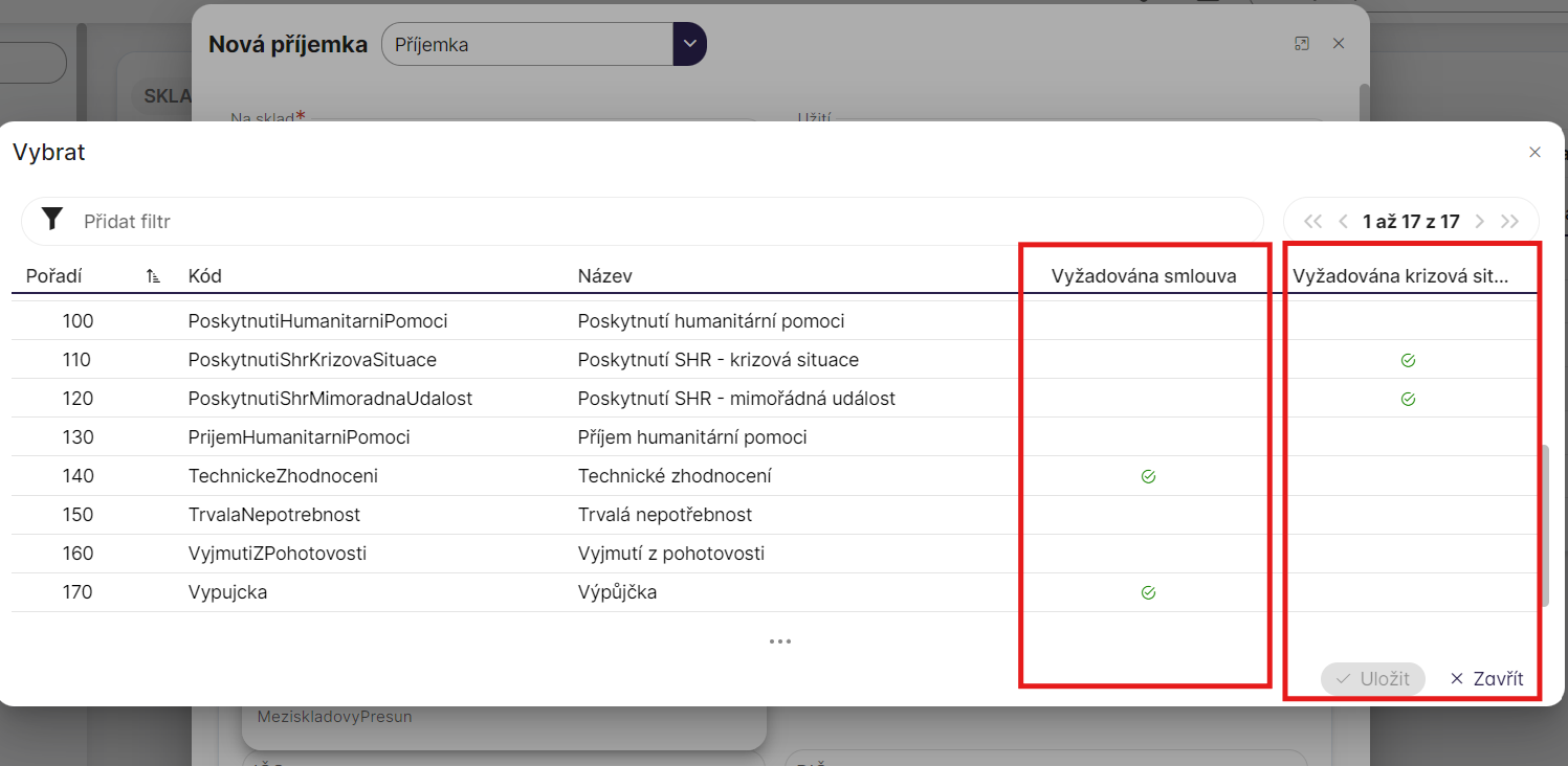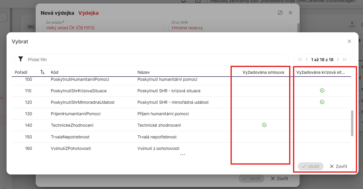 - Pole "Typ důvodu" - Na základě vybraného typu důvodu může formuláře požadovat doplnění dodatečných polí (Smlouva, Krizová situace). Při zobrazení tabulky typů důvodu je možné rozlišovat takové záznamy pomocí sloupců "Vyžadovaná smlouva" a "Vyžadovaná krizová situace". Tabulku typů důvodu si opět zobrazíte pomocí lupičky v roletce po kliknutí do pole "Typ důvodu"