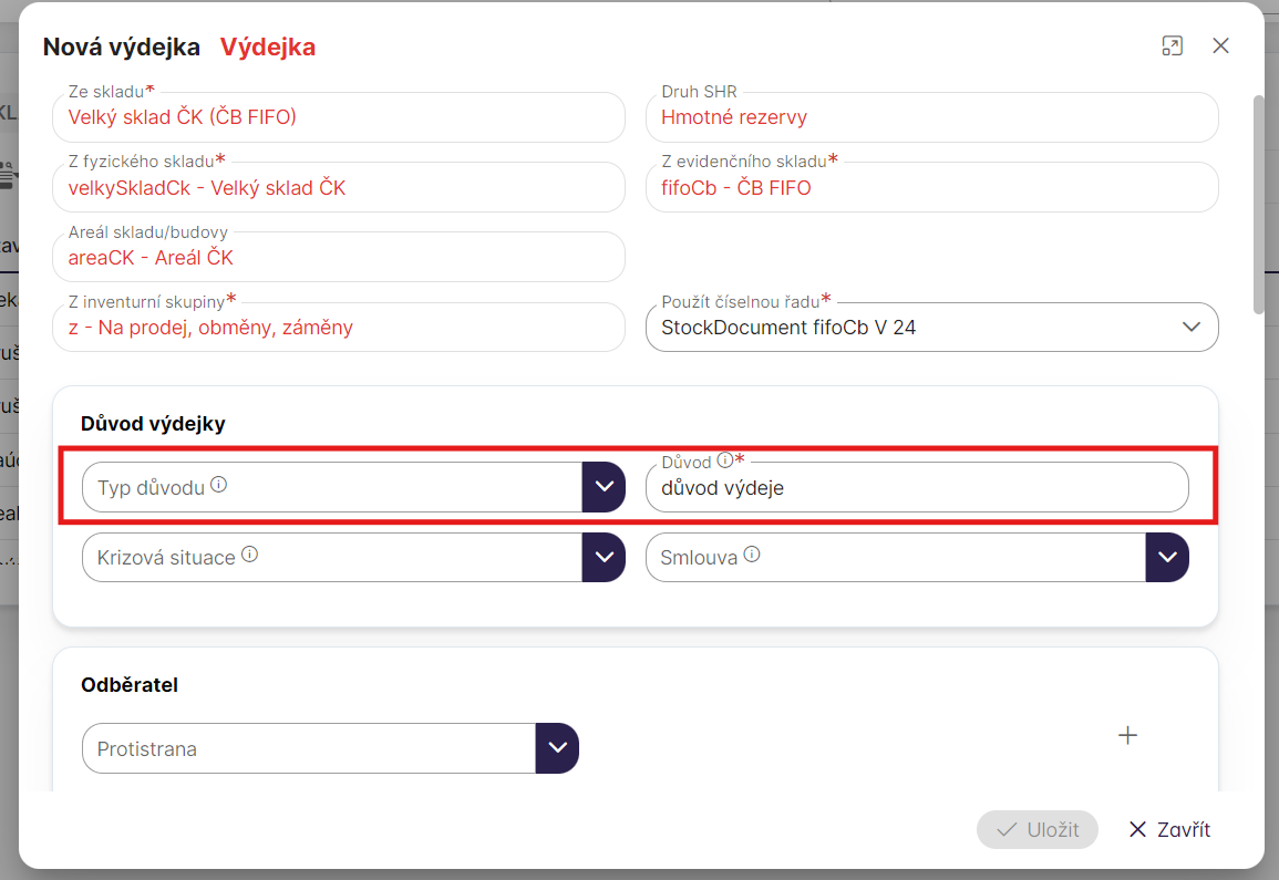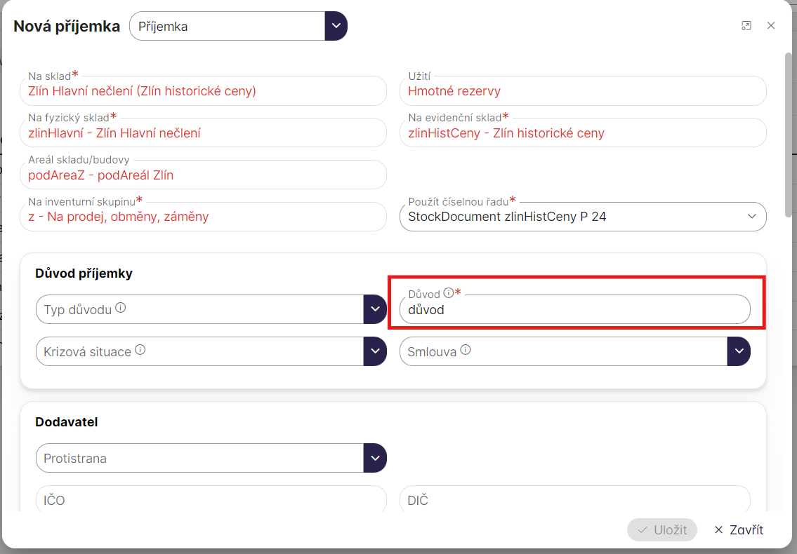 Pokud žádný z typů důvodu nevyhovuje důvodu dokladu je možné využít textové pole "Důvod" vpravo od pole "Typ důvodu" a do něj napsat důvod volným textem.