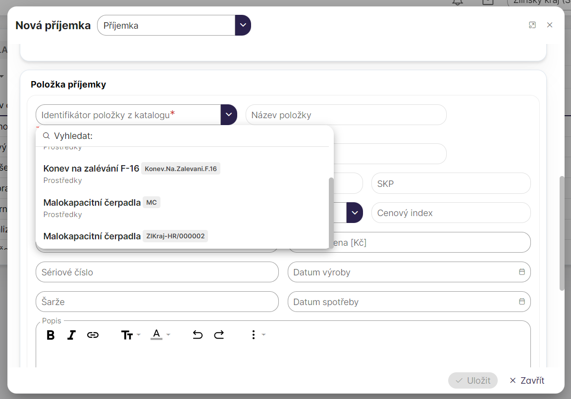 - Položka příjemky - Pro pole "Identifikátor položky z katalogu" se nabízí položky, které si buď ochraňovatel vytvořil ve svém katalogu, nebo položky z naplánovaných příjmů od SSHR. Položky z naplánovaných příjmů jsou z katalogu IRAP.