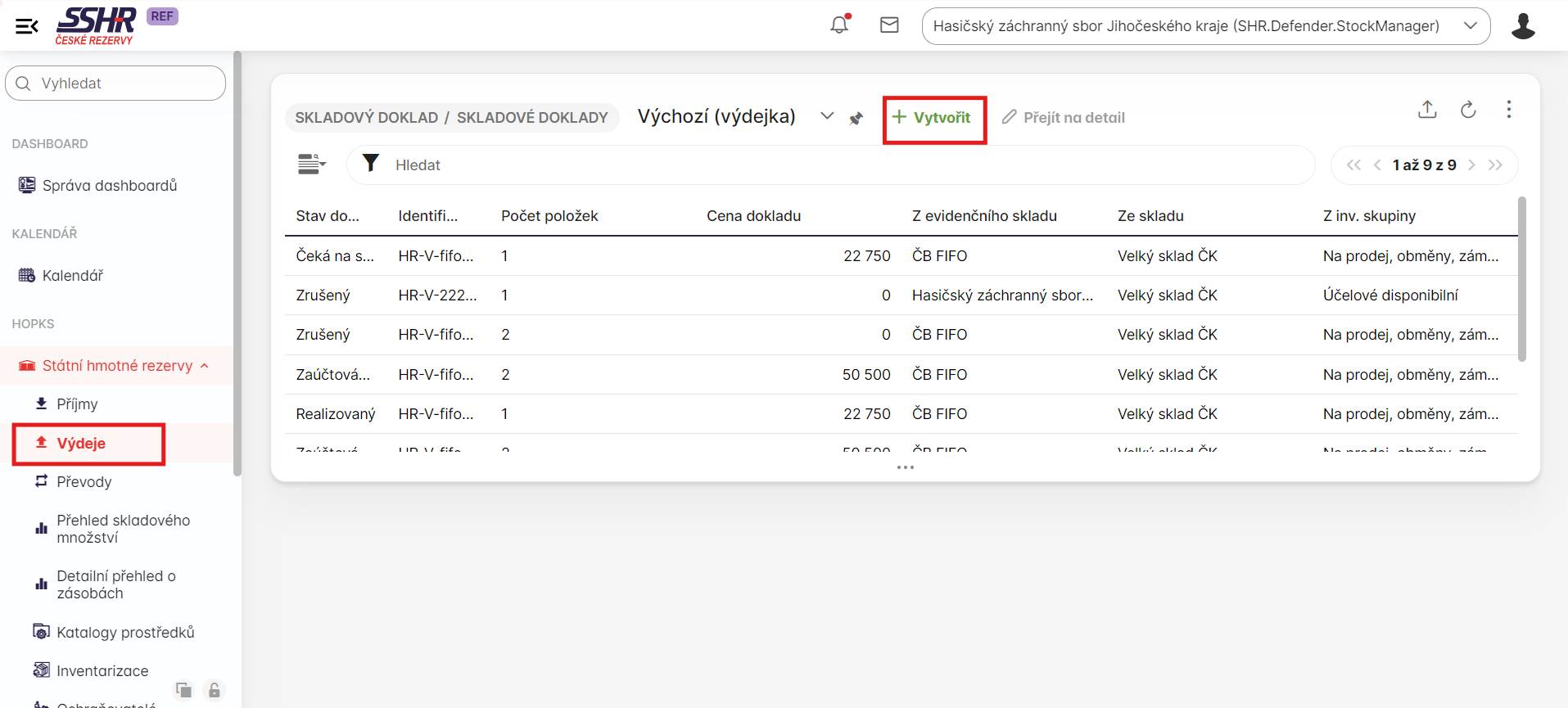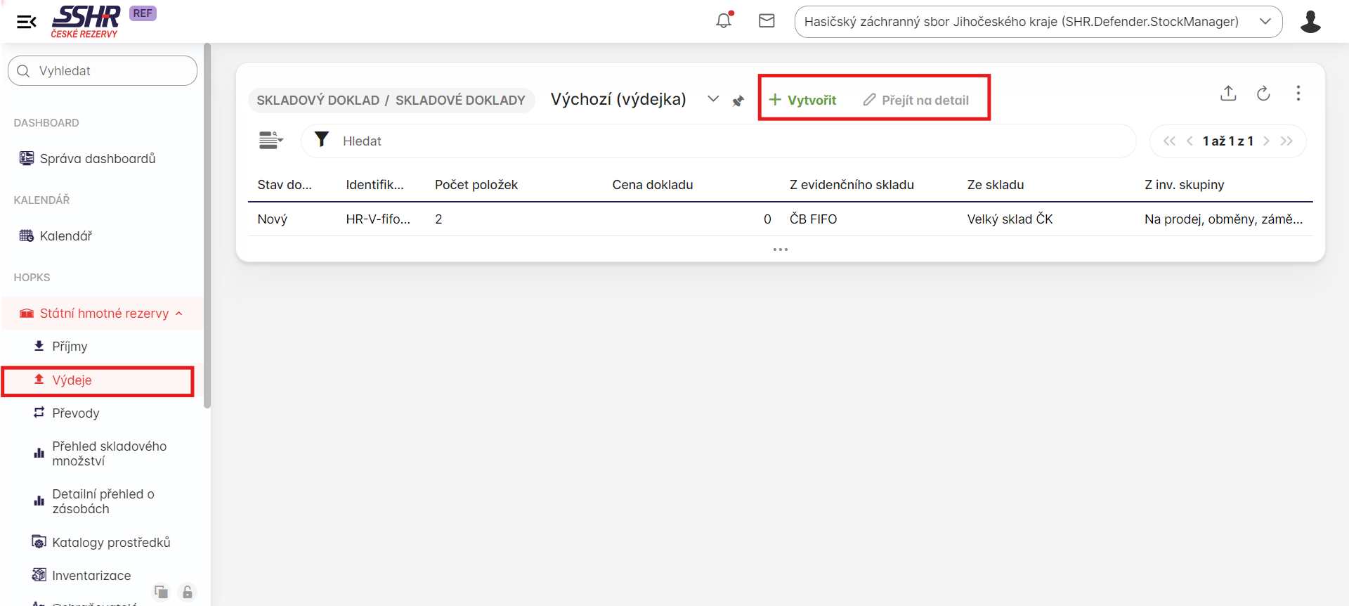 Kliknutím na řádek "Výdeje" v menu se zobrazí tabulka s vytvořenými doklady výdejů. V horní části tabulky jsou tlačítka "Vytvořit" a "Detail".