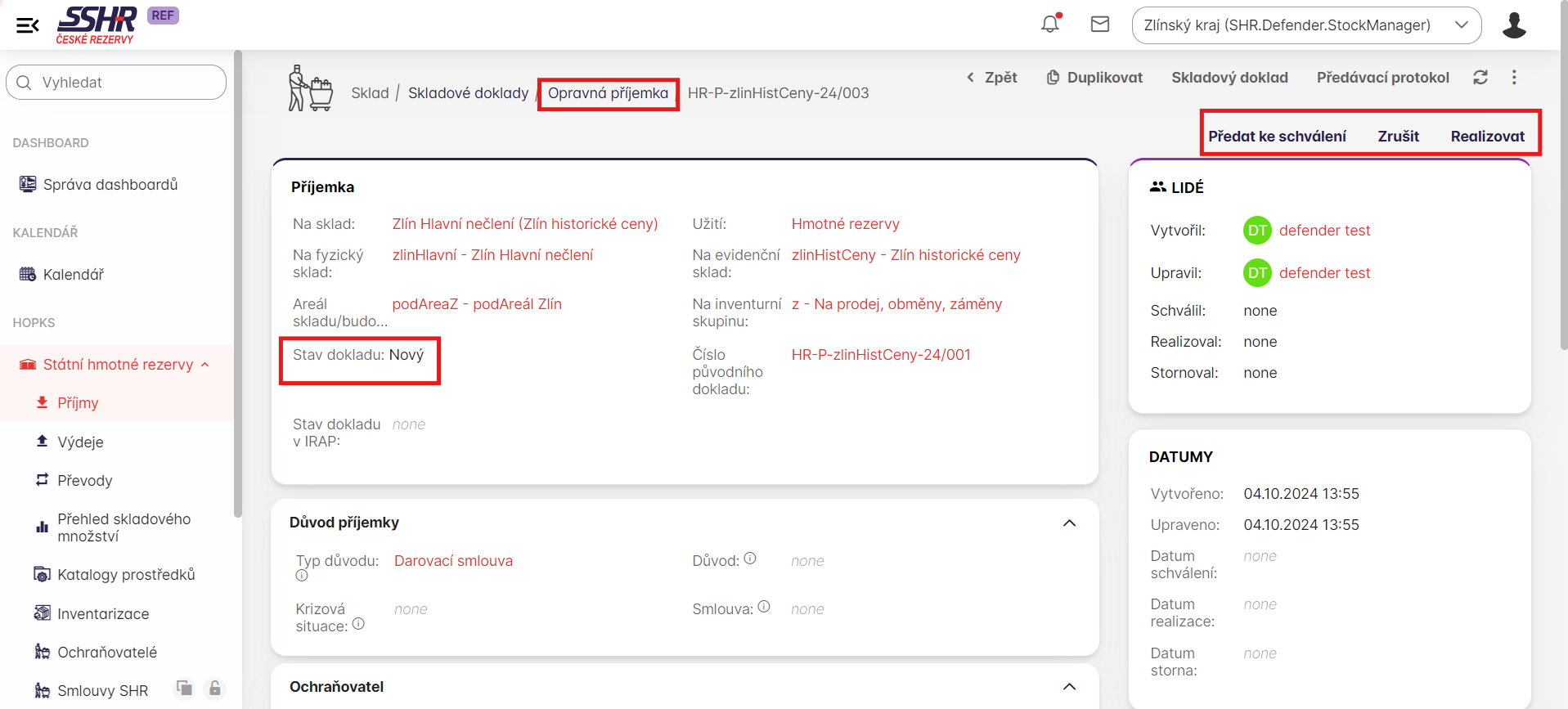 Právě vytvořený doklad přes tlačítko "Vytvořit" bude vždy začínat ve stavu "Nový". Ve stavu "Nový" se uživateli zobrazují tlačítka "Předat ke schválení" a "Zrušit". Tlačítko "Předat ke schválení" slouží pro roli SHR.Defender.StockOperator v případě změn na detailu dokladu po vytvoření. Doklad je tímto předán ke schválení roli SHR.Defender.StockManager, který zkontroluje změny a učí jejich korektnost. Role SHR.Defender.StockManager má možnost použít tlačítko "Předat ke schválení" pro situaci, ve které by nebyl SHR.Defender.StockOperator zapotřebí.