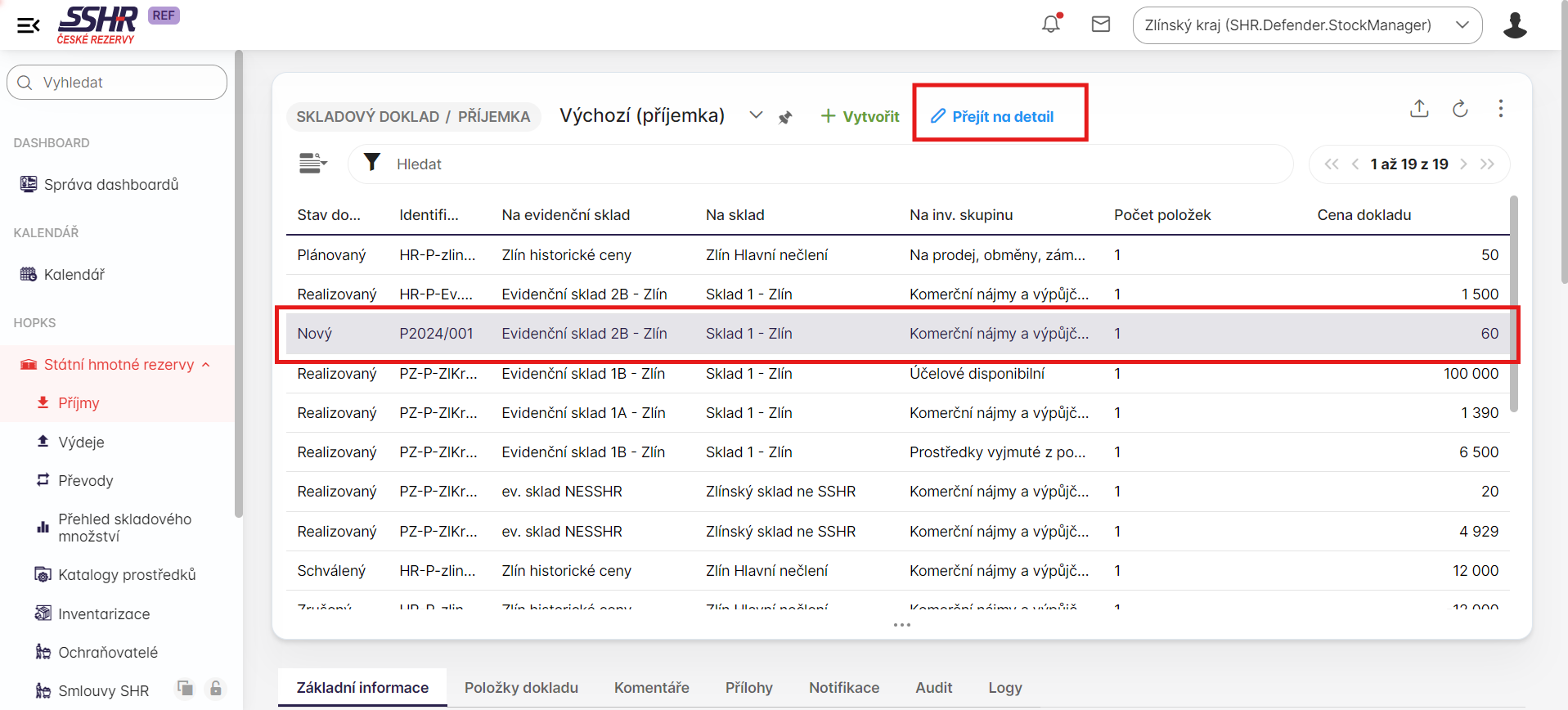 V přehledu vytvořených dokladů je nutné vybrat jeden řádek pro rozsvícení tlačítka "Přejít na detail" a použít tlačítko, nebo dvojklikem na konkrétní doklad zobrazit jeho detail.
