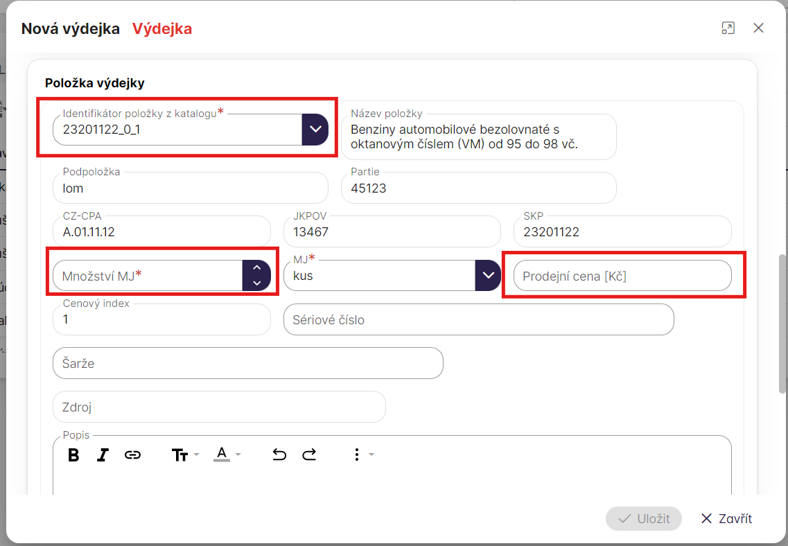 Po vybrání položky se automaticky doplní většina polí položky na základě dat z katalogu pro danou položku. Je potřeba dovyplnit pole "Jednotková cena" a "Množství" a z těchto údajů se dopočítá pole "Celková cena [Kč]"