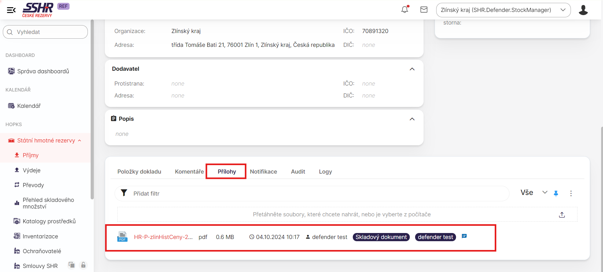 c) [Předávací protokol] - použitím tlačítka plánovací protokol se vygeneruje soubor PDF k vytištění a vyplnění během předání položky dokladu. Stisknutím tlačítka se soubor zobrazí ve spodní části obrazovky v záložce "Přílohy".