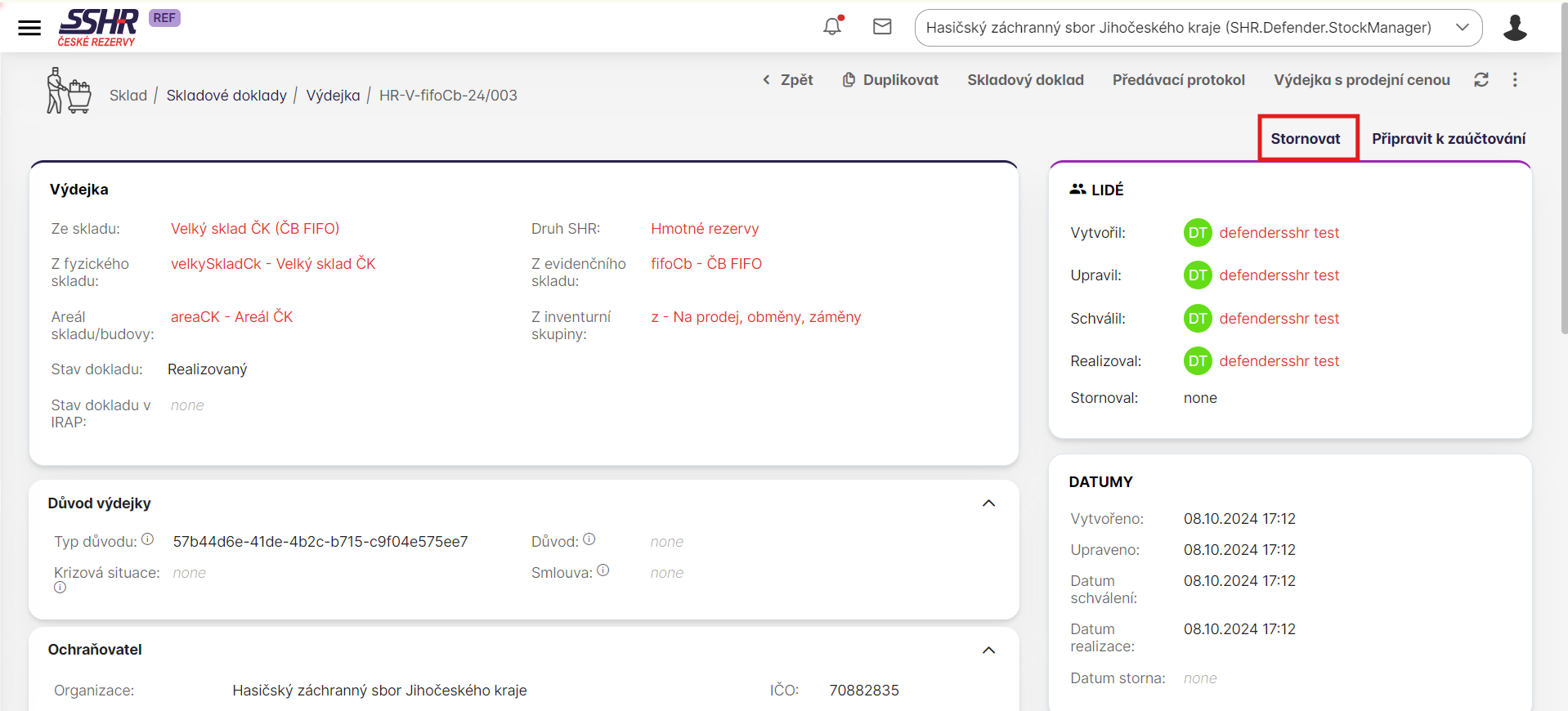 V případě, že by byl realizován doklad s chybou je možné použít tlačítko "Stornovat" v pravé horní části obrazovky.