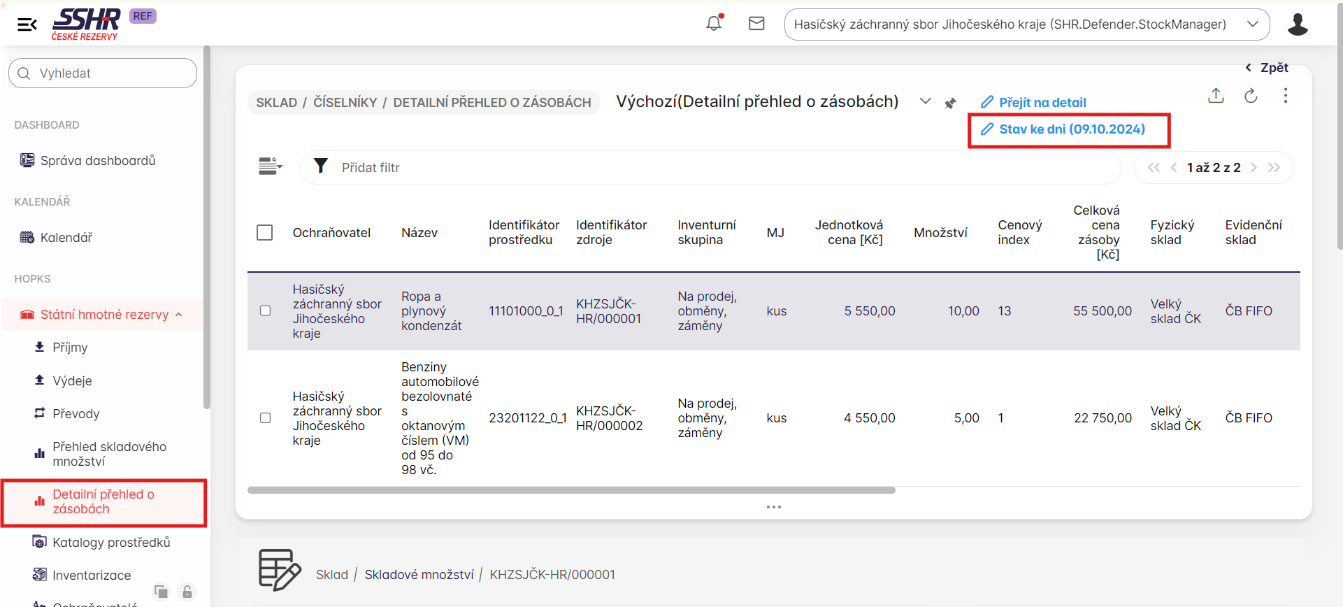 Vybrání požadovaného záznamu se zpřístupní tlačítko "Přejít na detail", nebo dvojitým kliknutím na konkrétní záznam jsem přesměrován přímo do detailu dílčí zásoby.
