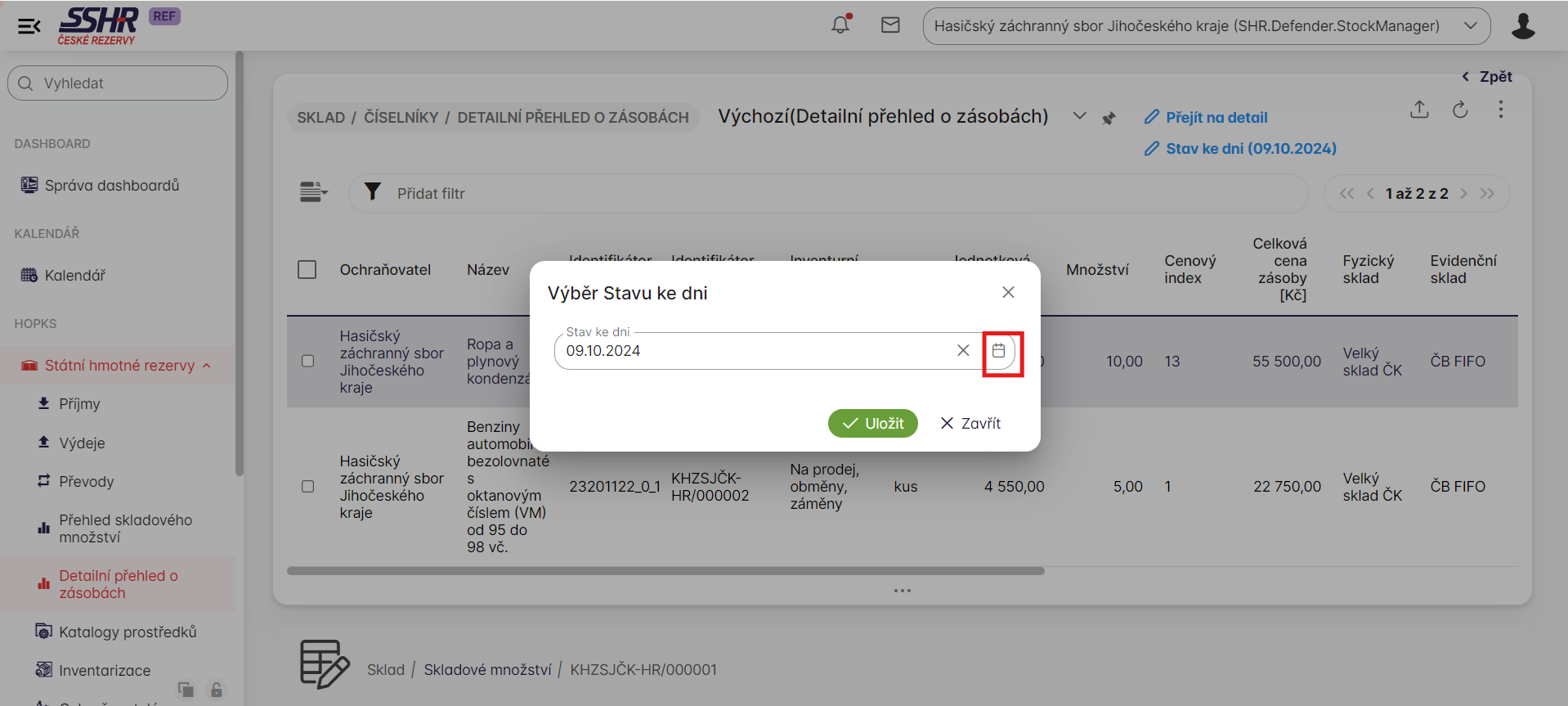 Detailní přehled o zásobách zobrazuje záznamy jednotlivých dílčích zásob z detailu záznamů "Obecný přehled o zásobách". Dílčí zásoby zobrazované v přehledu je možné si upravit ke dni, ke kterému mě zajímá počet zásob.
