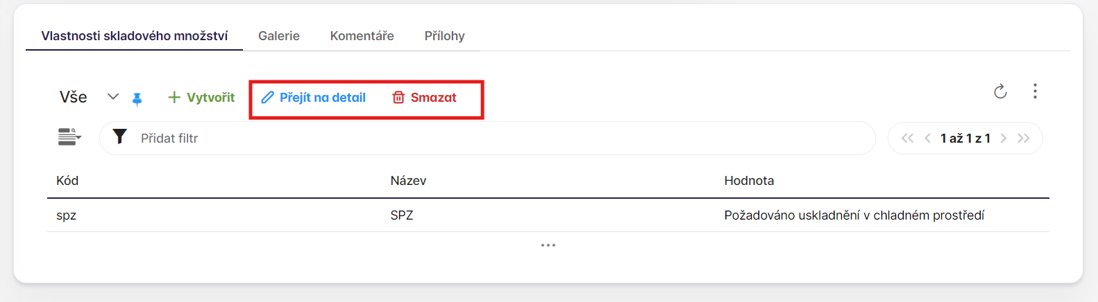Jednotlivé řádky vlastností je možné nadále editovat tlačítko "Přejít na detail", nebo mazat vybráním požadovaného řádku a kliknutím na tlačítko "Smazat".