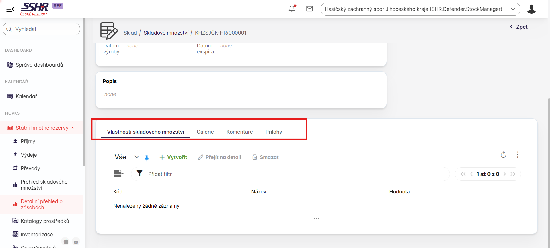 Detail záznamu detailní přehled o zásobách - Detail dílčí zásoby