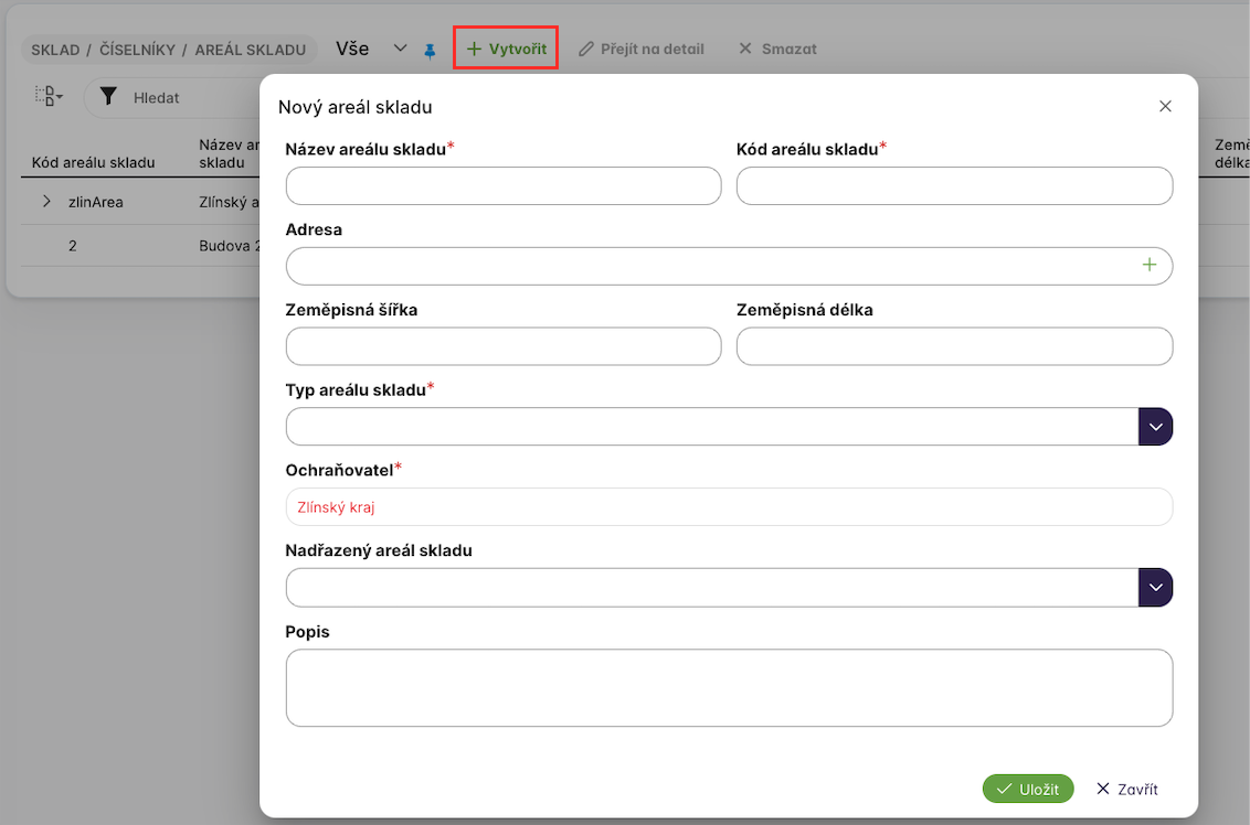 Uživatel klikne na seznamu Areál skladu na tlačítko + Vytvořit a zobrazí se mu dialogové okno Nový areál skladu.
