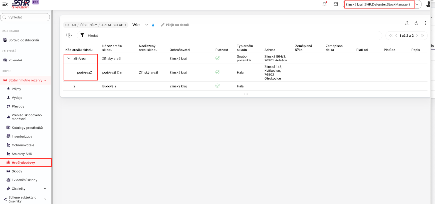 V přehledu Areály budovy je ve sloupci Kód areálu skladu zobrazena hiearchická struktura areálů. Dále uživatel vidí adresu, platnost a typ areálu. Poslední sloupec je popis, který může být delší a pak je vhodnější přepnout na zobrazení detailu.