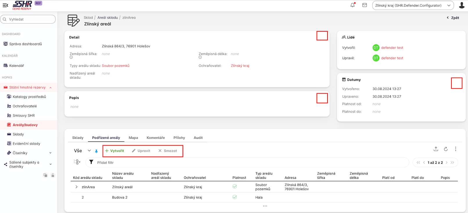Uživatel s rolí SHR.Defender.Configurator vytváří nové areály. Pole Ochraňovatel se vyplní automaticky, uživatel toto nemůže ovlivnit či změnit.