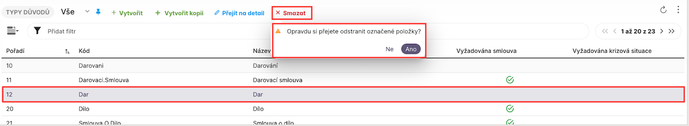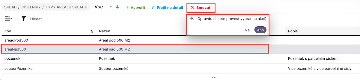 Vybrání jednoho záznamu a kliknutí na tlačítko Smazat může uživatel smazat položky Typu areálu skladu. Uživatel následně musí potvrdit akci smazání. Pokud je číselníková hodnota již použita, není z důvodu konzistentnosti dat smazání systémemem umožněno a uživatel je informován žlutou hláškou.