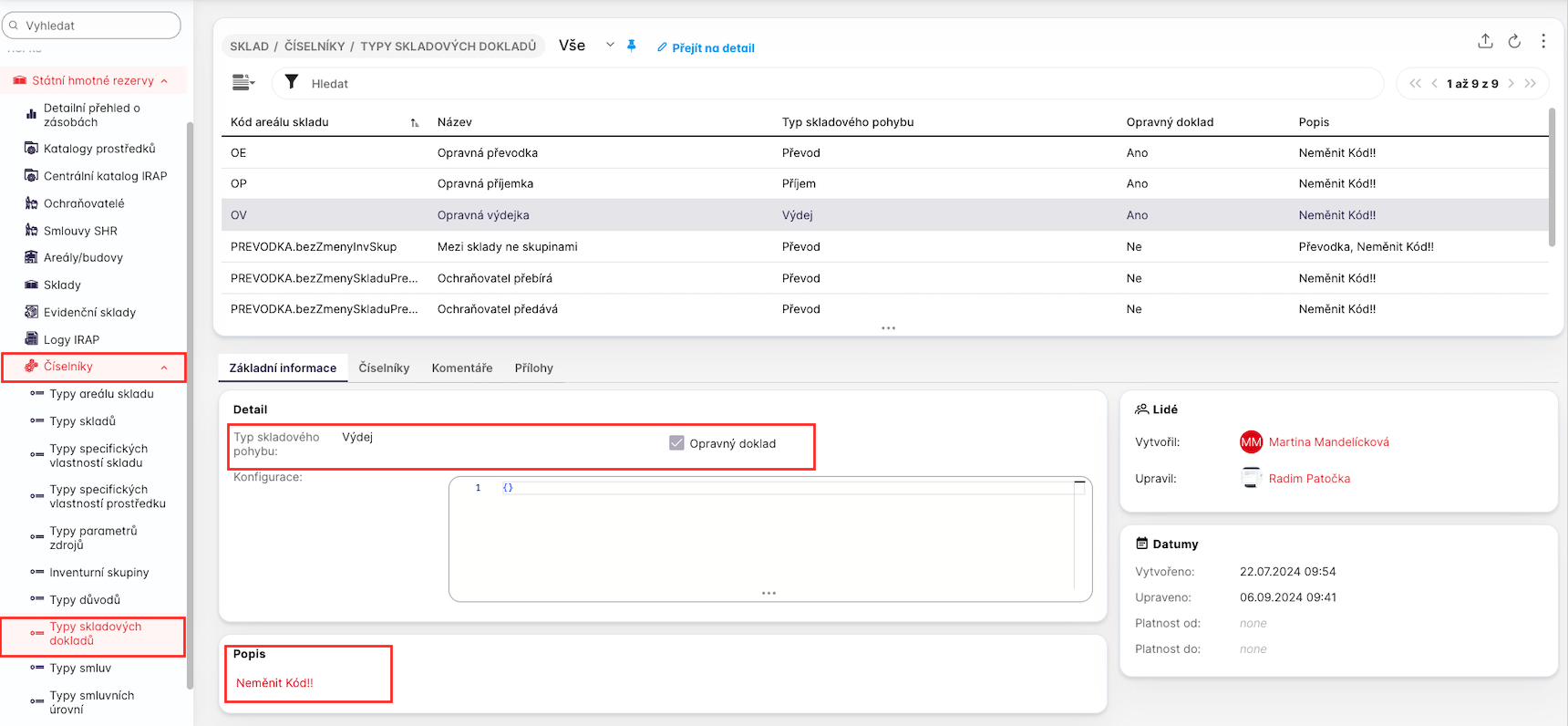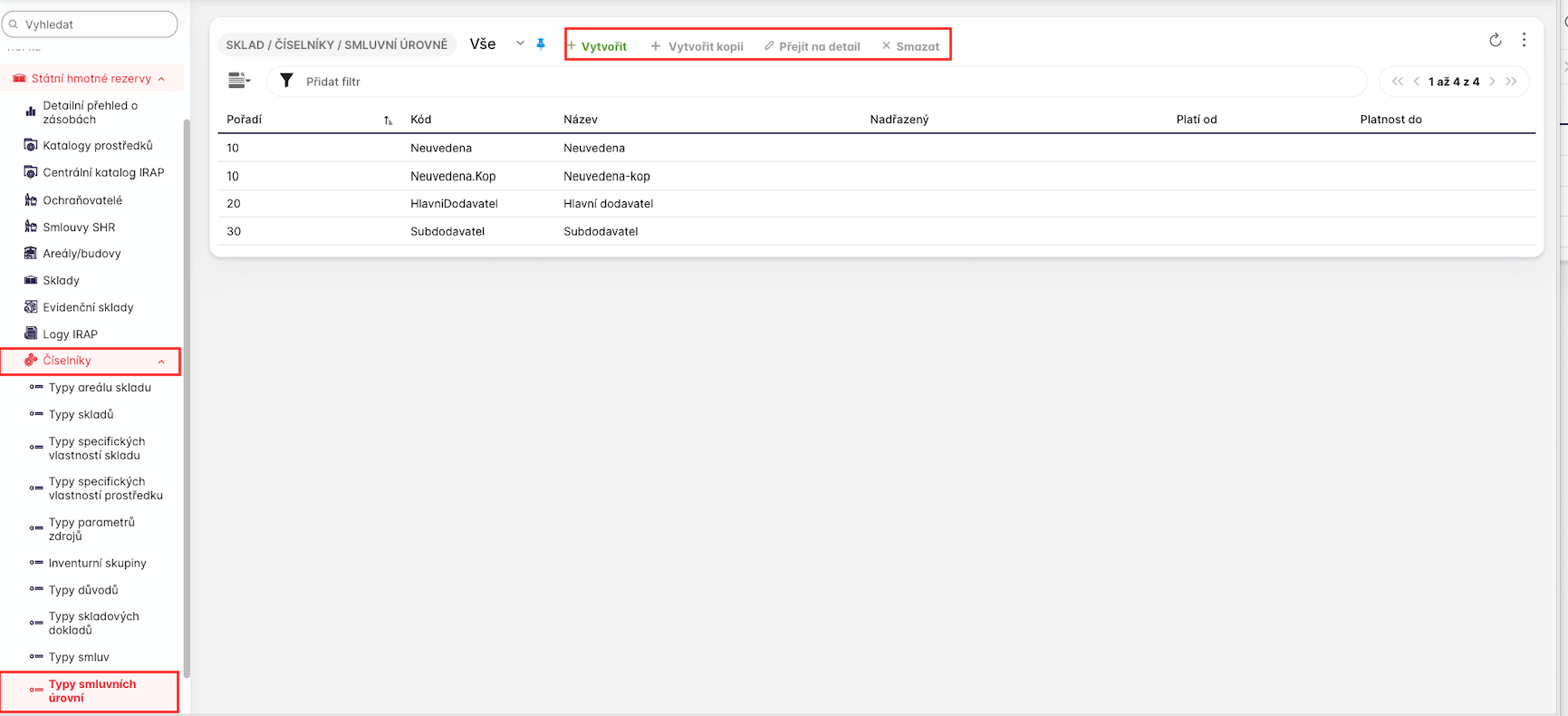 V části Státní hmotné rezervy - Číselníky může uživatel s rolí SHR.SSHR.Configurator spravovat jednotlivé záznamy pro kategorizaci skladů. Pouze z validních číselníkových hodnot může následně uživatel vybírat kategorie skladů.