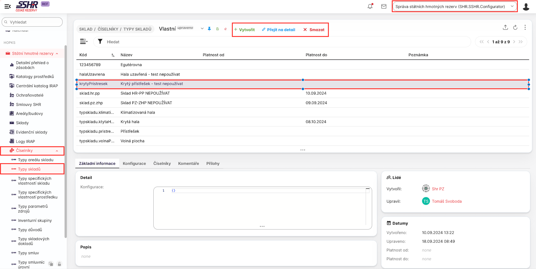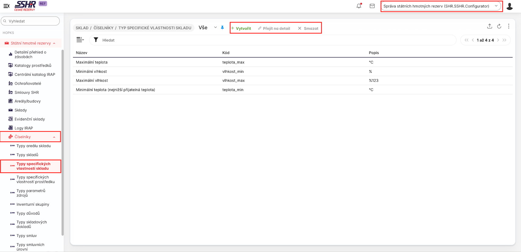V části Státní hmotné rezervy - Číselníky může uživatel s rolí SHR.SSHR.Configurator spravovat jednotlivé záznamy pro kategorizaci specifických vlastností skladu. Pouze z validních číselníkových hodnot může následně uživatel vybírat vlastnosti skladů. Samotné použití hodnot se vyplňuje v záložce na detailu skladu.