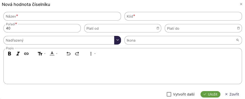 Pole Konfigurace a Číselníky není třeba vyplňovat a jsou pro pokročilejší nastavení číselníku. Nastavení aktuální (prázdné) je plně odpovídající funkcionalitám v této uživatelské příručce.