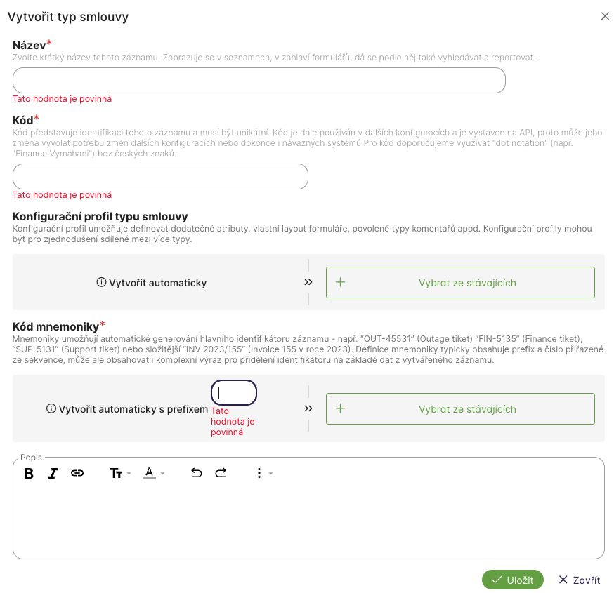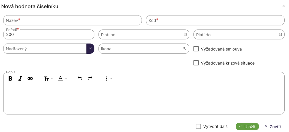 Kliknutí na tlačítko Vytvořit se uživateli zobrazí dialogové okno Nový záznam číselníku parametrů. Povinně se musí vyplnit Název a kód a je možné vyplnit popis. Popis může sloužit pro bližší specifikaci. Jako povinné pole musí být vyplněn Typ parametrů. Jedná se buď o číselnou hodnotu (umožňuje následně vložit na zdroji pouze čísla), textovou hodnotu ((umožňuje následně vložit na zdroji jakékoliv dovolené znaky - text), checkbox ((umožňuje následně vložit na zdroji hodntu ano/ne) a datum ((umožňuje následně vložit na zdroji údaje ve formátu datum z kalendáře).