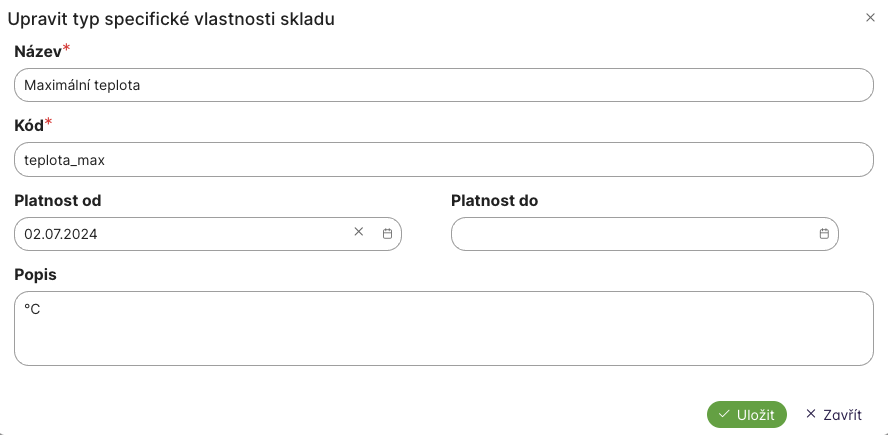 Kliknutí na tlačítko Vytvořit se uživateli zobrazí dialogové okno Vytvořit typ specifické vlastnosti skladu. Povinně se mus í vyplnit Název a kód a je možné vyplnit popis. Popis může sloužit pro bližší specifikaci. Uživatel může vyplnit i časovou platnost záznamu.