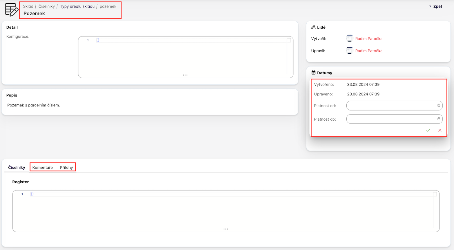 Vybrání jednoho záznamu a kliknutí na tlačítko Přejít na detail nebo vybráním dvojklikem může uživatel editovat položky Typu areálu skladu. Uživatel může: