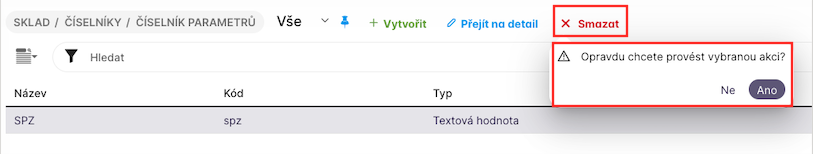 Vybrání jednoho záznamu a kliknutí na tlačítko Smazat může uživatel smazat položky Typu parametru zdroje. Uživatel následně musí potvrdit akci smazání. Pokud je číselníková hodnota již použita, není z důvodu konzistentnosti dat smazání systémem umožněno a uživatel je informován žlutou hláškou.