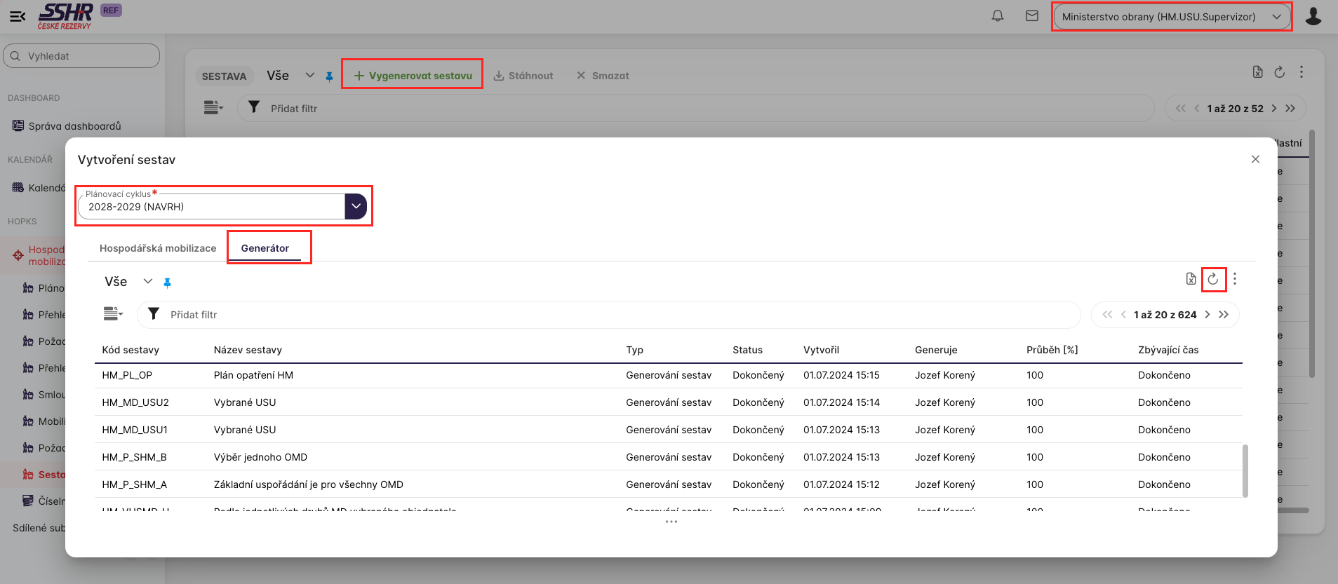 Sestava se generuje tlačítkem ##Vygenerovat sestavu.## Po jeho stisknutí se otevře tabulka pro definování toho, jakou sestavu si přeje uživatel vygenerovat. Uživatel musí vybrat plánovací cyklus, za který chce sestavu generovat. Každá z uživatelských skupin (role v modulu Hospodářská mobilizace) může mít své kategorie a druhy sestav k vygenerování.