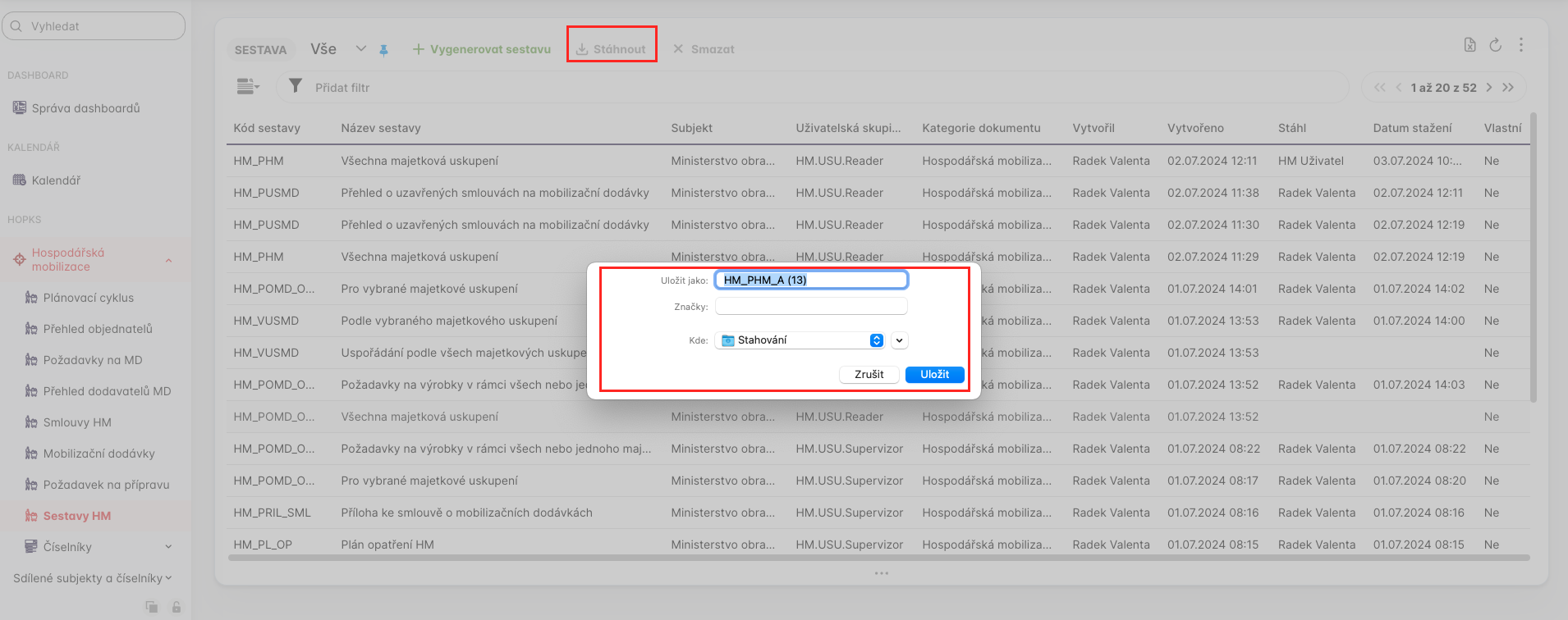 Po jejím označení kliknutím na řádek s názvem sestavy se v horním menu zobrazí možnost tlačítka Stáhnout