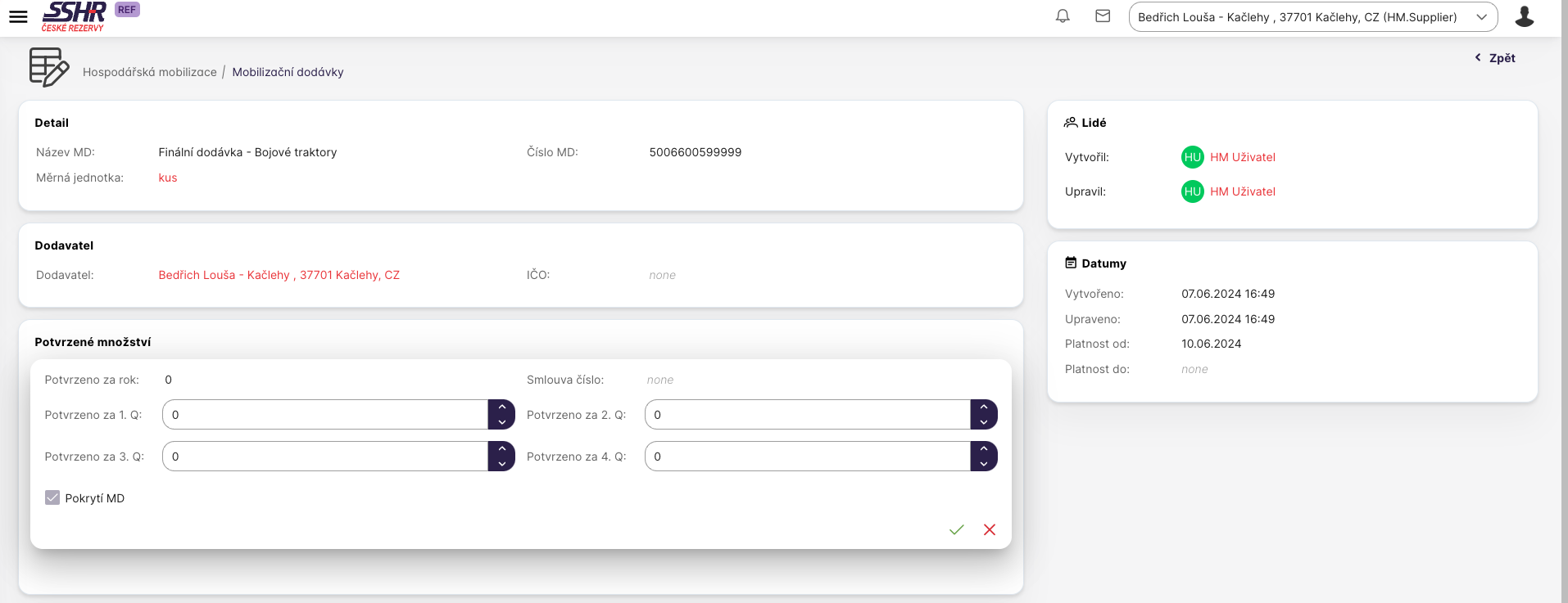 Dvojím kliknutím na řádek přehledu Mobilizační dodávky se může uživatel dostat na detail mobilizační dodávky.