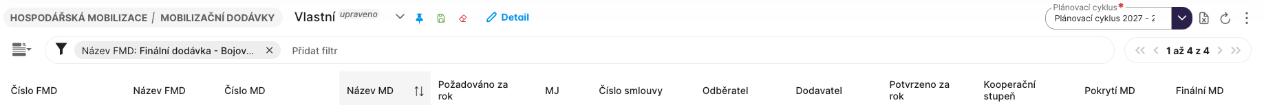 Kliknutí do řádku filtru může uživatel zvolit jen finální mobilizační dodávky. Vybere filtr Kooperační stupeň a zadá hodnotu "0"