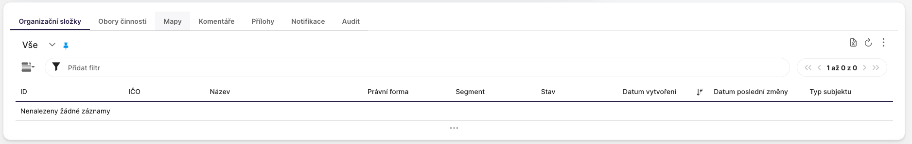 Vyhledávání subjektů se realizuje prostřednictvím filtru na řádku filtru. Uživatel může buď přímo fulltextově vyhledávat, nejčastěji podle Názvu vytvářeného potenciálního dodavatele nebo podle IČO nebo IČP (Identifikační číslo provozovny). Druhou možností je kliknutí na řádek Filtr a aplikace nabídne různé druhy filtru.
