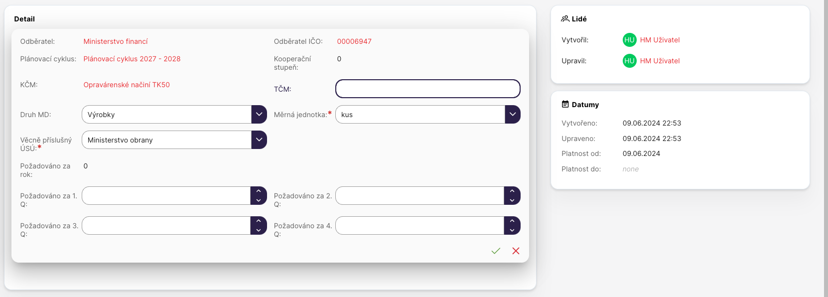 Uživatel může editovat položku TČM, Druh MD, Věcně příslušný ÚSÚ, Měrnou jednotku a doplnit požadované množství měrných jednotek za jednotlivá čtvrtletí. Aplikace automaticky dopočítává celkově požadované množství za rok a toto číslo u požadavku zobrazuje v přehledu požadavku na MD.