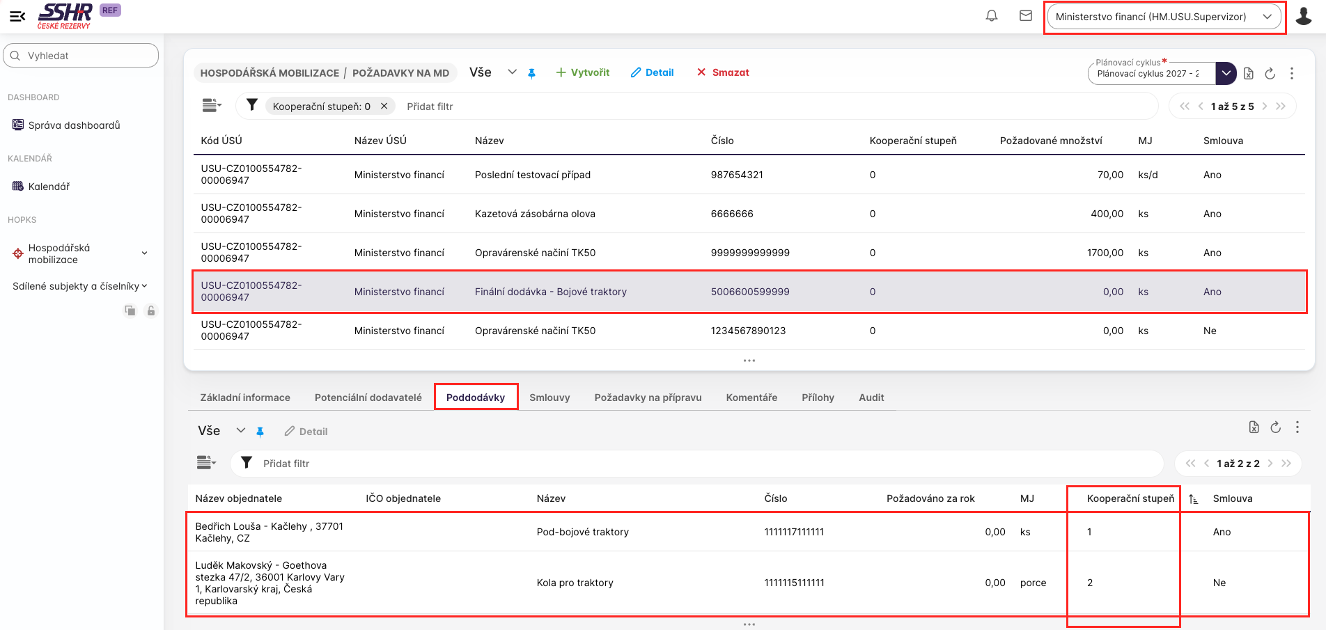 Výchozí zobrazení obsahuje pouze požadavky na MD nultého "0" kooperačního stupně, kdy jsou to všechno požadavky vytvořené ÚSÚ přihlášeného uživatele. Zrušením filtru Kooperační stupeň: 0 kliknutím na X se zobrazí všechny požadavky, tedy i nižšího stupně vážící se k požadavkům objednatele (ÚSÚ).