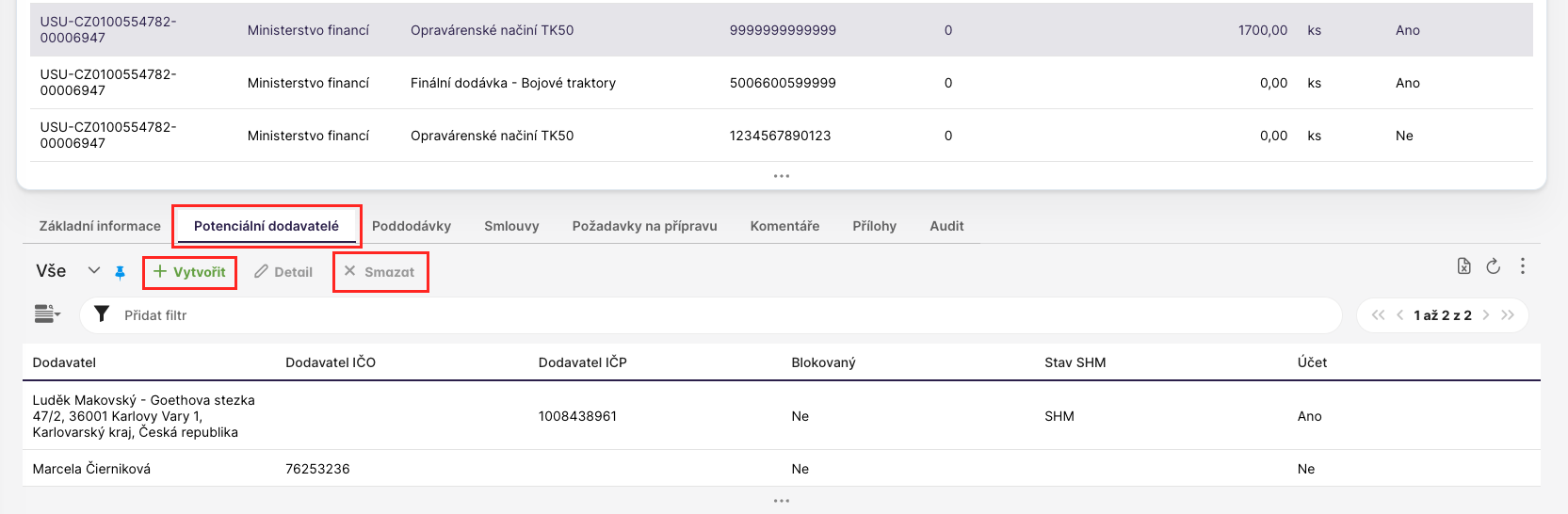 Vybráním potenciálního dodavatele a kliknutím na tlačítko smazat a následném potvrzením možnosti Ano uživatel Smaže potenciálního dodavatele. Touto akcí neodstraňuje subjekt nebo organizační složku podniku z aplikace či z jiného požadavku na MD, pouze se odstraní vazba mezi požadavkem na MD a smazaným potenciálním dodavatelem.