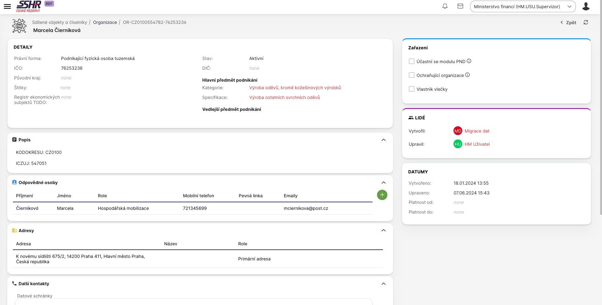 Dvojím kliknutím na záznam vytvořeného dodavatel se uživatel dostane na detail tohoto subjektu s informacemi, ve kterém vidí především Odpovědné osoby, adresy a v záložkách Organizační složky, Mapu s umístěním primární adresy, Komentáře, Příloh a Notifikace.
