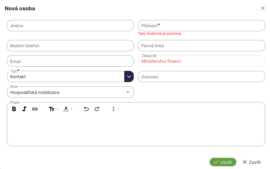 Uživatel vyplňuje Jméno, Příjmení, Mobilní telefon, Pevná linka a Email. Automaticky je předvyplněn zvolený objednatel. Vybírá Typ - kontakt a dále vybírá roly osoby - zde vybírá osobu pro modul Hospodářská mobilizace. Dále může uživatel uvést popis/poznámku k uvedené odpovědné osobě a tlačítkem uložit tuto odpovědnou osobu vytvoří.