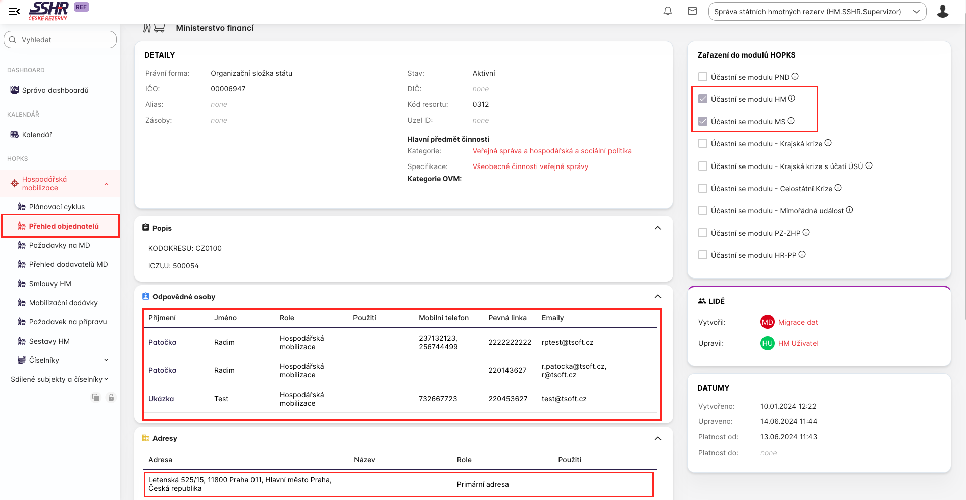 Sekce Odpovědné osoby ukazuje osoby a jejich kontakty a role tohoto objednatele - tuto položku může editovat (resp. přidávat nové osoby) uživatel s rolí HM.USU.Supervizor.